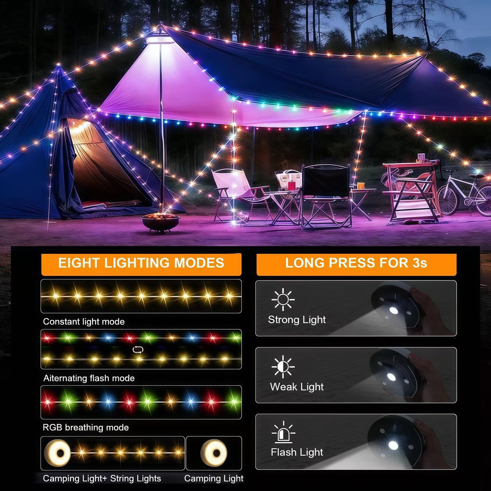 【8 Multifunctional Lighting Modes to Meet Various Needs】Whether you need to create a warm atmosphere or provide practical lighting, this outdoor camping string light can meet your needs, offering eight lighting modes. Available modes include: Warm Light String Light, RGB Alternating Flashing, RGB Breathing Light, Camping Warm Light, Camping Strong Light, XTE Strong Light Mode, XTE Weak Light Mode, and XTE SOS Flashing Mode. It's not only a camping essential, but also a decoration for holiday parties, tent embellishments, and even indoor ambient lighting. You can easily switch between camping light and string light modes to enjoy diverse light and shadow effects at any time.