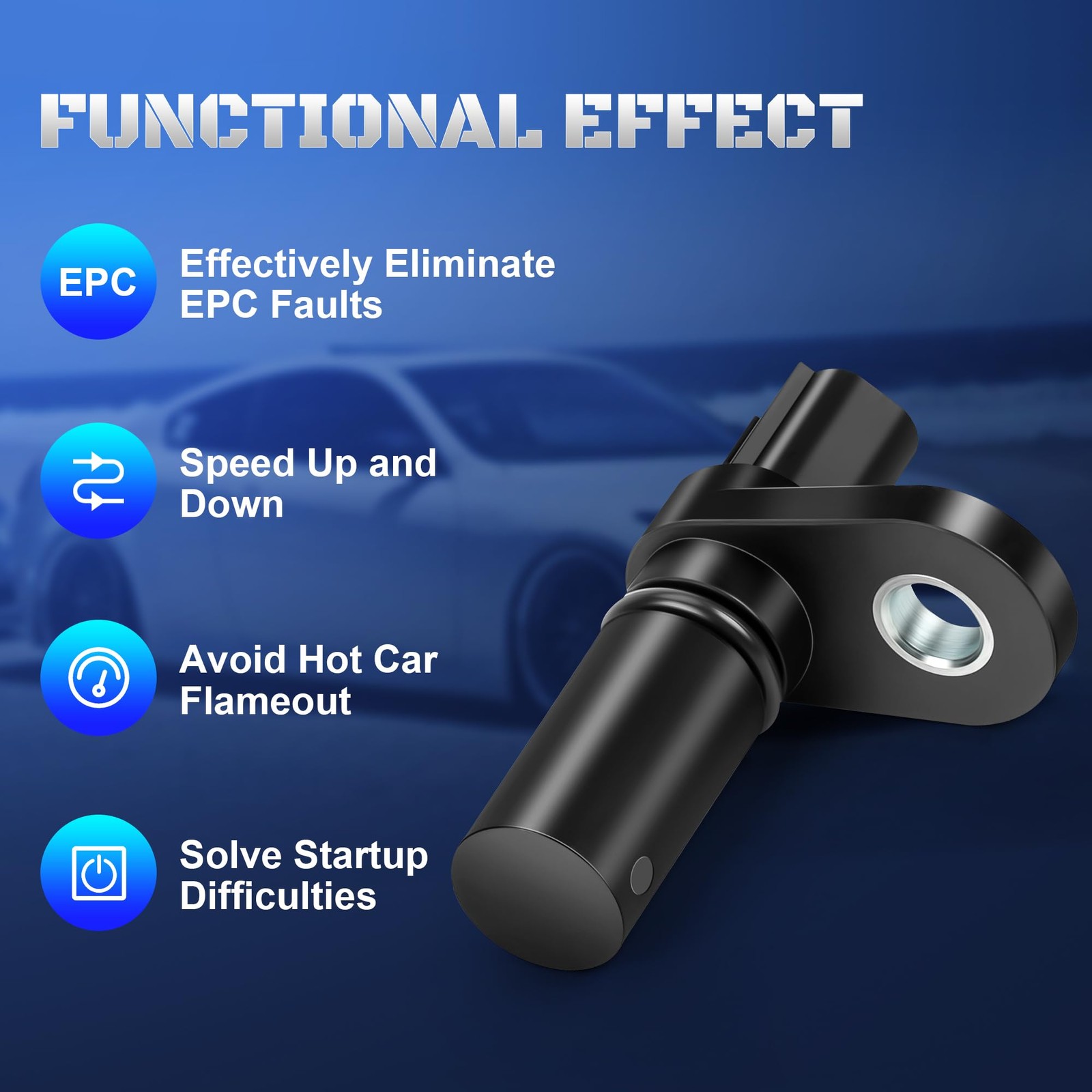 Function: Camshaft sensor is an electronic device used in an engine that measures the rotation and position of the camshaft and feeds the data to the vehicle’s engine control module. ECM uses this data to control when to command spark and fuel for the best engine efficiency. when the cam sensor fail it can lead to vehicle intermittent stalling, hard to start, CEL comes on, uneven acceleration, engine misfires or vibrates, you maybe need to replace it