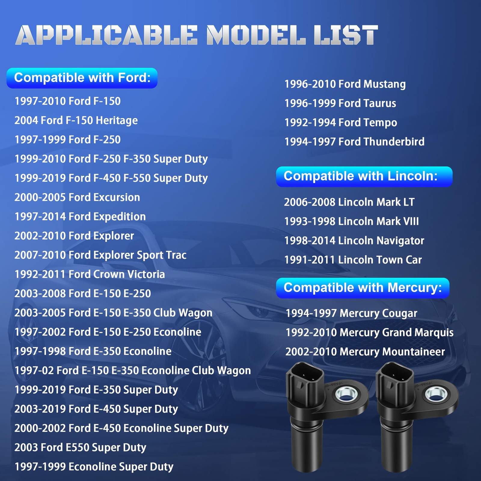 Vehicle Fitment: This engine camshaft position sensor compatible with 1997-2010 Ford F150 F250 F350 F450 F550 Expedition, 2002-2010 Explorer, 2000-2005 Excursion, 1996-2010 Mustang, 2003-2008 E150 E250 E350, for 2006-2008 Lincoln Mark LT, 1998-2014 Lincoln Navigator, 1992-2010 Mercury Grand Marquis and more