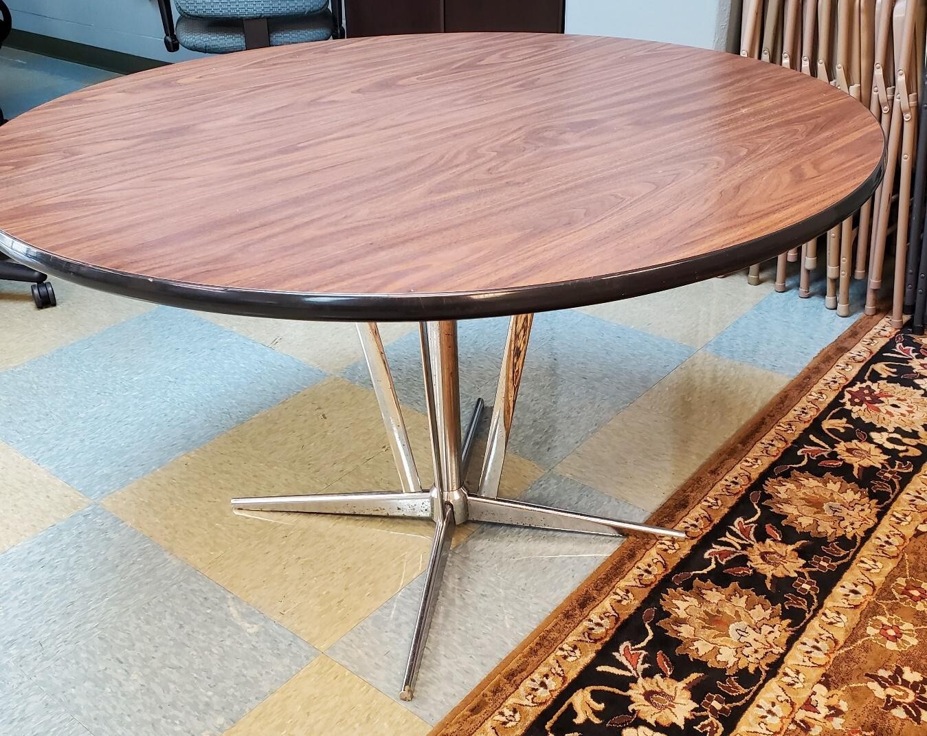 Add a touch of retro charm to your dining room with this Retro Round Dining Table. With a sleek metal post finish and a sturdy wooden tabletop, this table is perfect for both casual and formal occasions. The round shape adds a unique touch to your seating, while the chrome and steel accents give your space a modern twist. This original, indoor dining table has a seating capacity of four and features a tabletop thickness of 40 inches. The material and retro style make this table a perfect addition to any kitchen or dining room. Don't miss out on the opportunity.