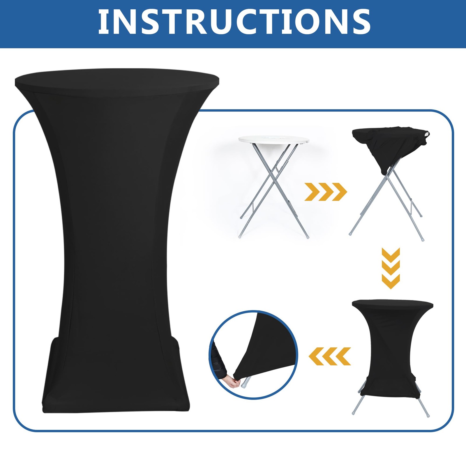 Stable and Anti-Slip Leg Pocket Design: These fitted stretchy cocktail table linen feature 4 reinforced elastic leg pockets, which securely grip the table legs, keeping the hightop tablecloths in place and ensuring a snug fit for your cocktail high boy tables. Made of stretch spandex, the covers easily stretch in all directions, offering both non-slip and windproof properties, providing stable support for your events
