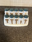 VINTAGE GRIFFITHS MILK GLASS SPICE JAR SET 10 W/ white rack and Green caps