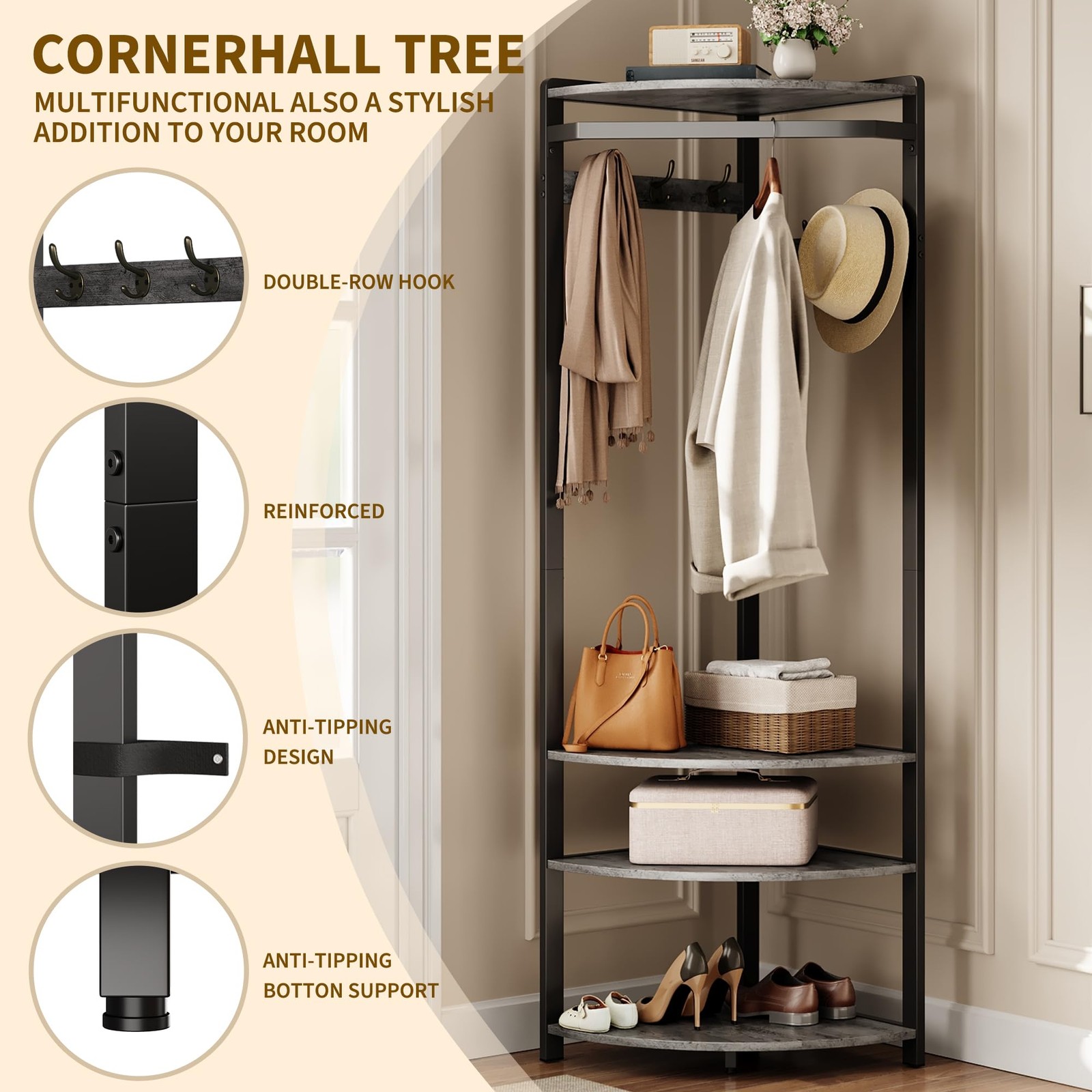 Multi-functional Corner Coat Rack - Our 3 in-1 narrow Corner Coat Rack combines a coat rack, shoe rack and top storage rack. The clothes hanging rod, with 6 double hooks, provides plenty of space for your daily hanging options and keeps your entrance area tidy, making it a home organizer for your entrance, bedroom, and living room.