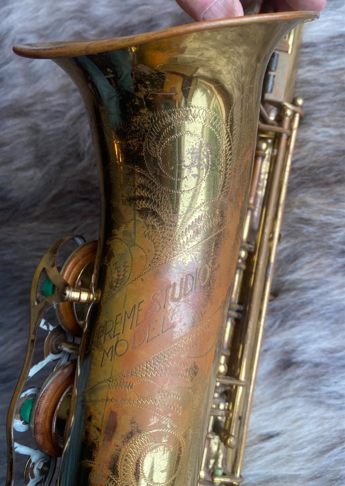 French made by Couesnon and stenciled as a “Studio Supreme”, this horn was likely made in the ‘50’s and was once considered a gem, but has obviously seen better days. It is a little too complex for me to take on as a project on my own (I am a player, but have limited technician skills.) It is missing a key touch button and the neck screw.