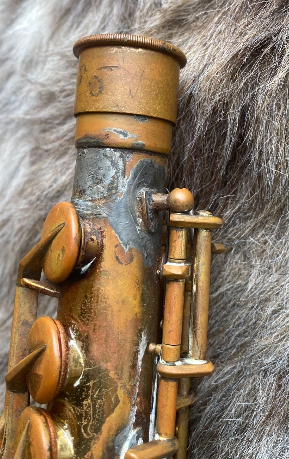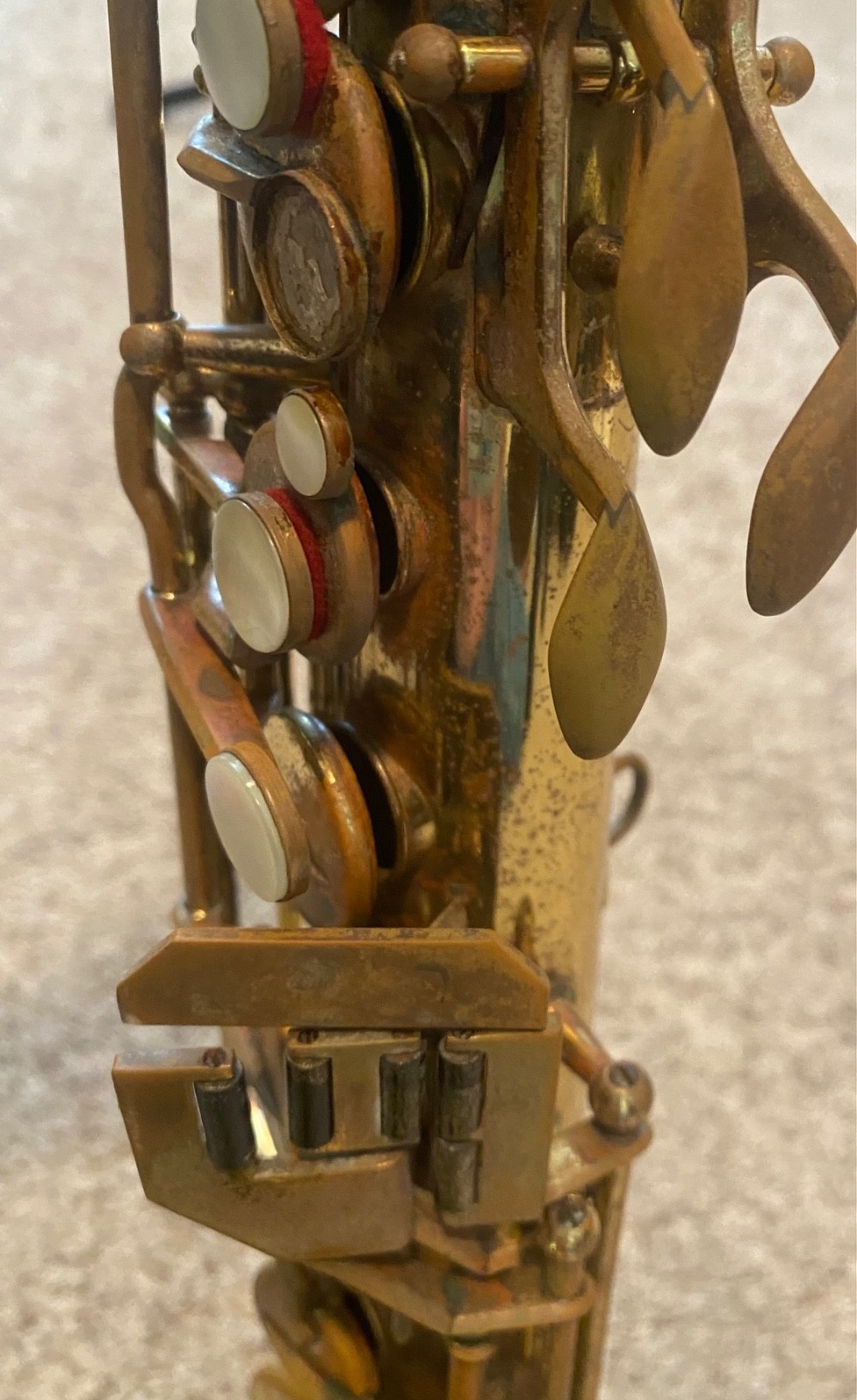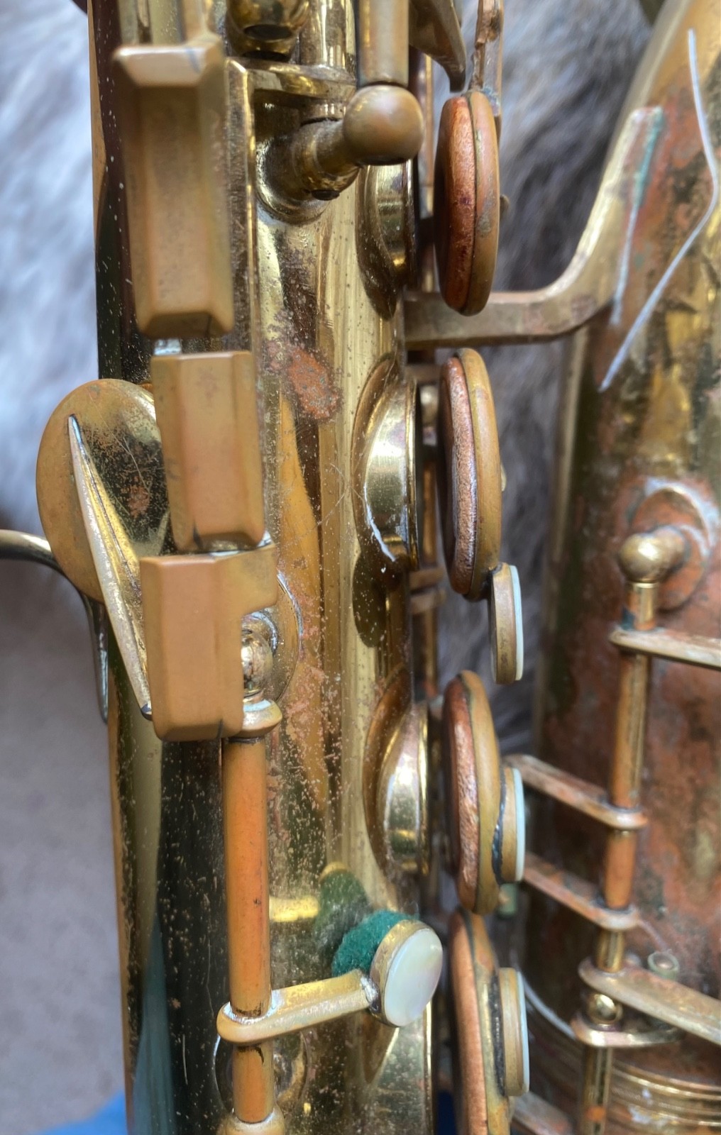 Great bones, and it features rolled tone holes and a double neck socket. But it will need many pads, and the octave rod somehow re-attached at the top or rebuilt. Lots of lacquer wear and some grime. Also has a bit of a dent on the bell lip and the neck cork is gone. Please see all the pictures. There is some kind of ugly solder work at the very top of the body and a slight denting at the thumb hook.