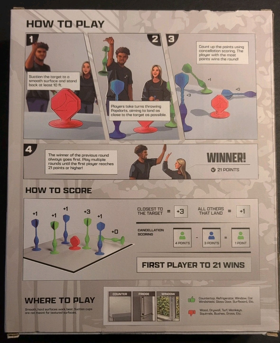 Surfaces: The darts stick to any smooth, non-porous surface, such as countertops, windows, or glass doors, making it versatile for indoor and outdoor play.