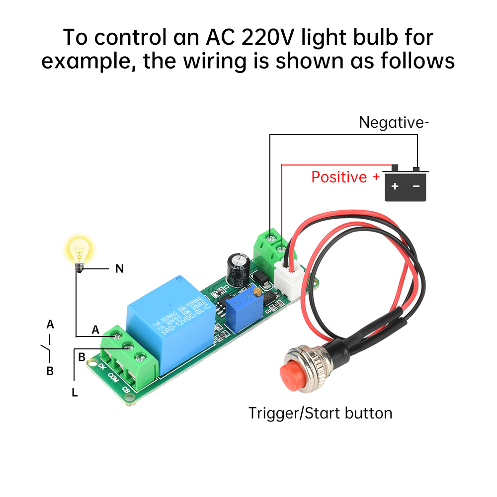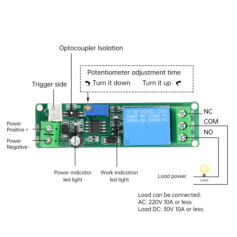 2. Adjustable time, flexible adaptation: through the built-in potentiometer, the user can adjust the delay time according to the actual demand, the range accurately covers 1-10 seconds, to meet the needs of diverse application scenarios.