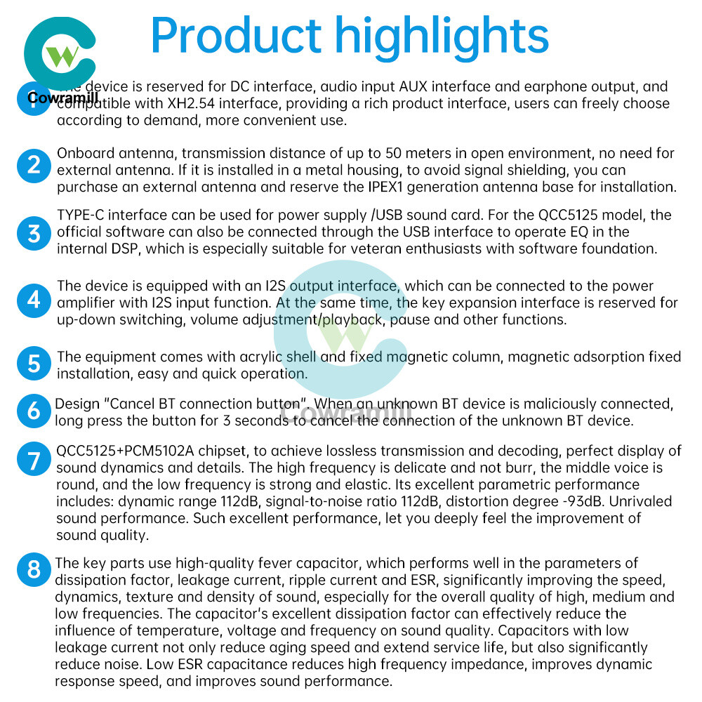 7. QCC5125+PCM5102A chipset, realize lossless transmission and decoding, perfectly show the sound of each dynamic and details. The high frequency is delicate and not burr, the midrange is rounded, and the low frequency is powerful and elastic. Its excellent parameters include: dynamic range of 112dB, signal-to-noise ratio of 112dB, distortion -93dB, highlighting the unparalleled sound quality performance. With such excellent performance, you can deeply feel the sound quality improvement.
