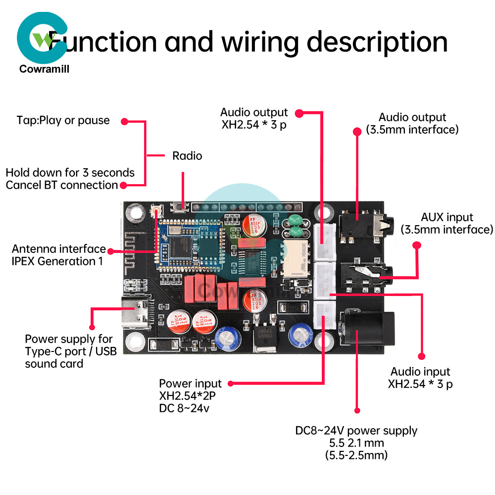 1. The device is reserved for DC interface, audio input AUX interface and headphone output port, and compatible with XH2.54 interface, providing a wealth of product interfaces, users can freely choose according to demand, more convenient to use.