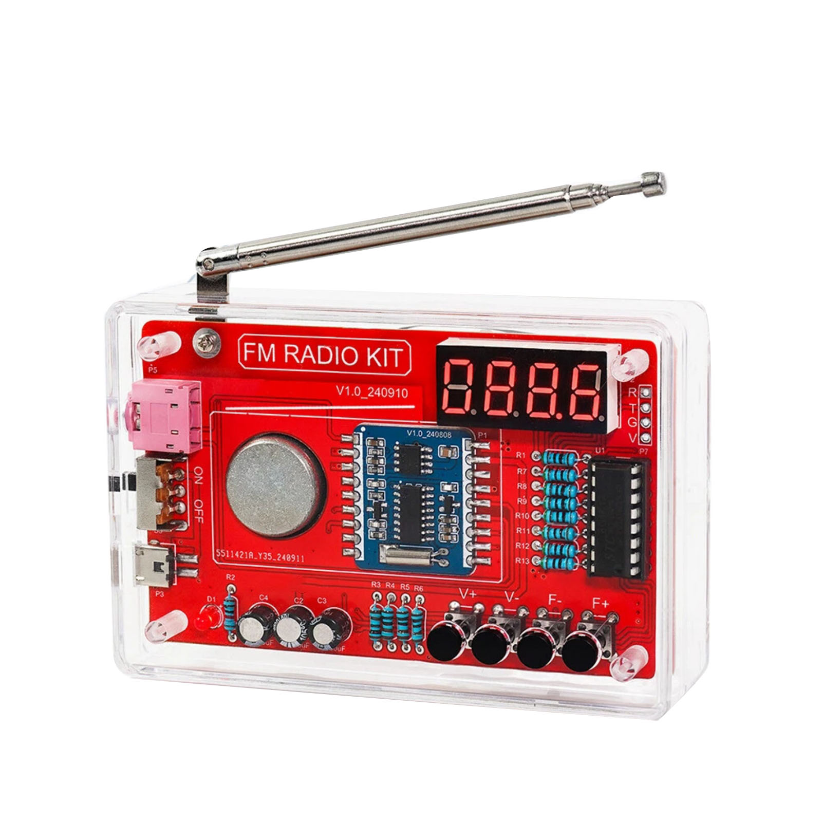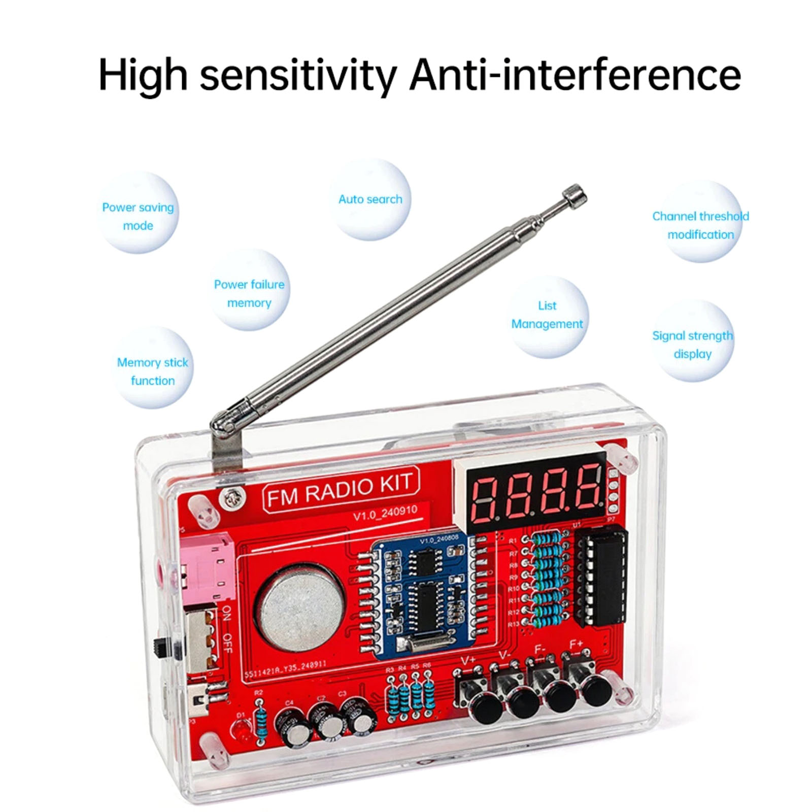 Feature: Simple operation, easy to weld, with 4Ω3W speaker sound quality is better. With RDA5807 radio module, with noise elimination, bass enhancement, high sensitivity, low noise, anti-interference ability and other advantages. Key adjustment, switch channel volume up and down, clear all channels and re-search and save the station. There are 15 sound level adjustment, can be adjusted to your satisfaction with the sound. LED lights show the operation status. With power failure memory, automatic search and storage function. Wide range of application, suitable for school teaching, cultivate interest, scientific research and development, DIY enthusiasts and so on.