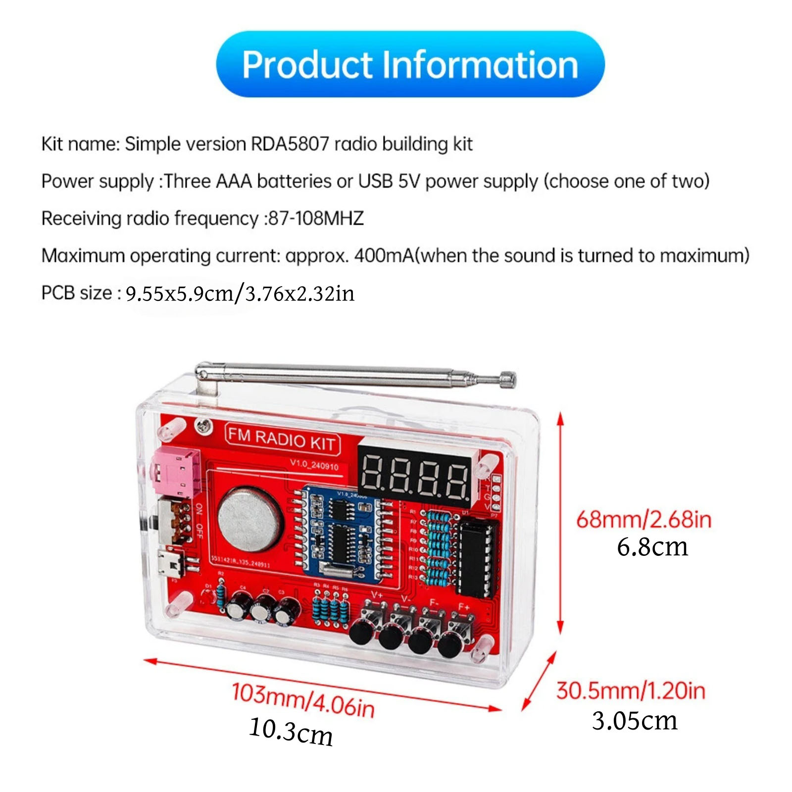 Specification: Kit name: simple version of RDA5807 radio production kit Power supply: 3 x AAA batteries or USB 5V power supply (choose one)(Without battery) Receive radio frequency band: 87-108MHZ Maximum operating current: about 400mA (in the case of the sound is adjusted to the maximum) PCB size: 9.55x5.9cm/3.76x2.32in
