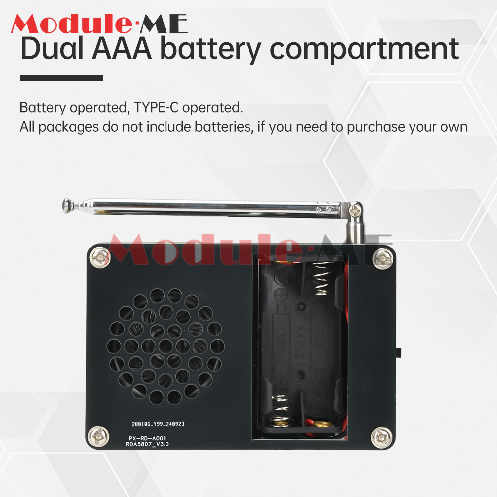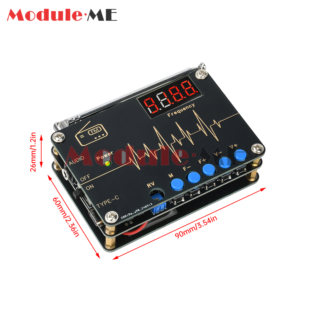 Specification Dual power supply: Type C 5V/2 batteries 7 power supply (shipment does not include batteries) Power supply voltage: 5V/3V Frequency range: 87-108MHz Output power: 0.5W Speaker: 1/2W 8R speaker Product size: 90*60*26mm PCB board size: 90*60mm