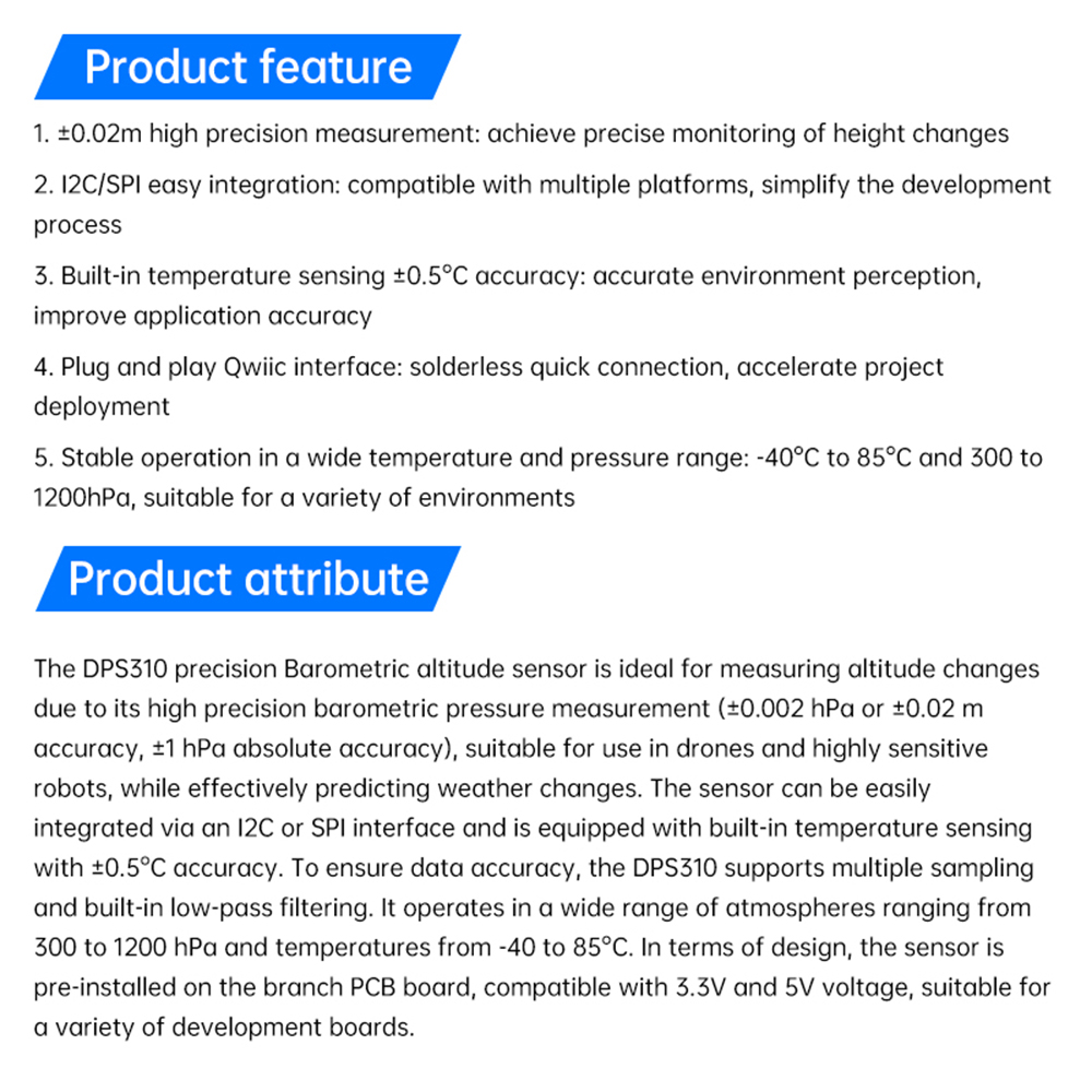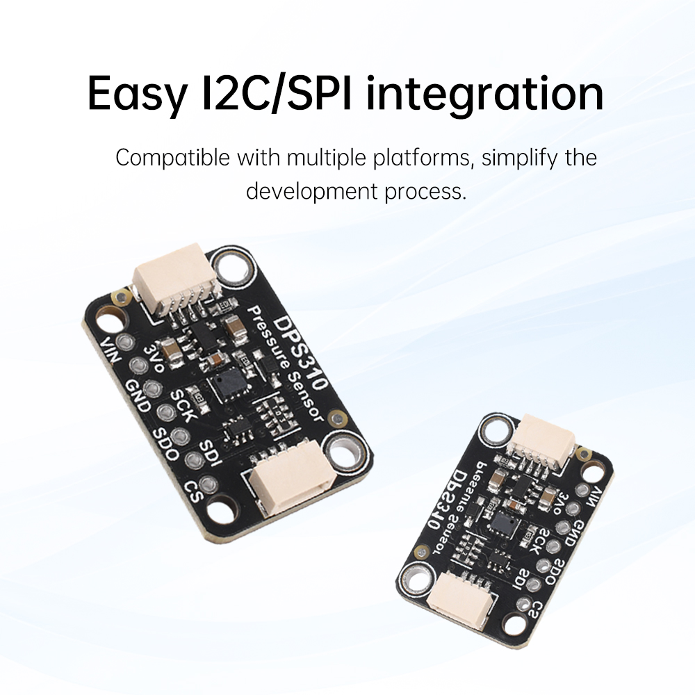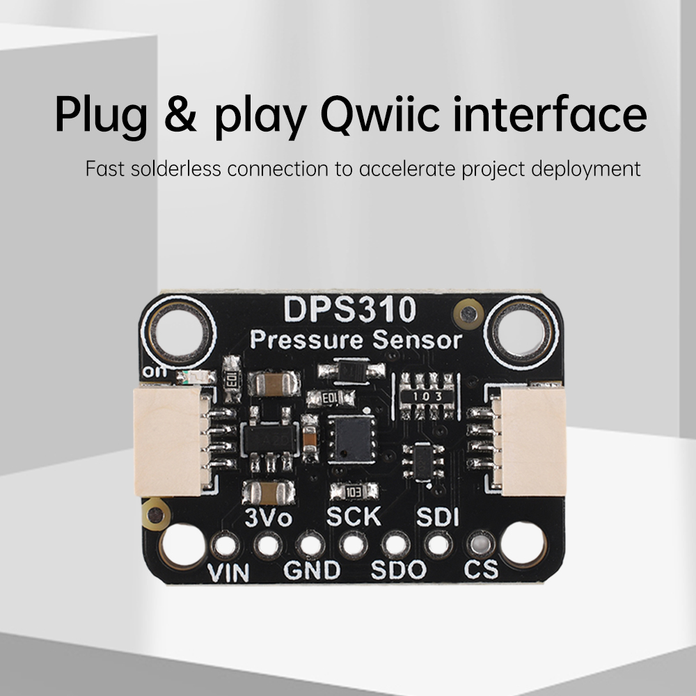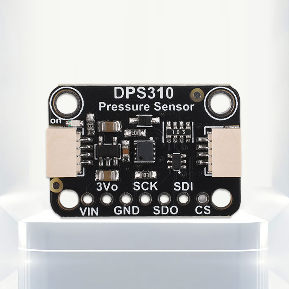 To ensure data accuracy, the DPS310 supports multiple sampling with built-in low-pass filtering. It operates in a wide range of environments, covering air pressure from 300 to 1200 hPa and temperature ranges from -40 to 85°C. The sensor is designed to operate in a wide range of environments. Designed with the sensor pre-installed on a breakout PCB, the DPS310 is compatible with 3.3V and 5V voltages, and is suitable for a wide range of development boards.