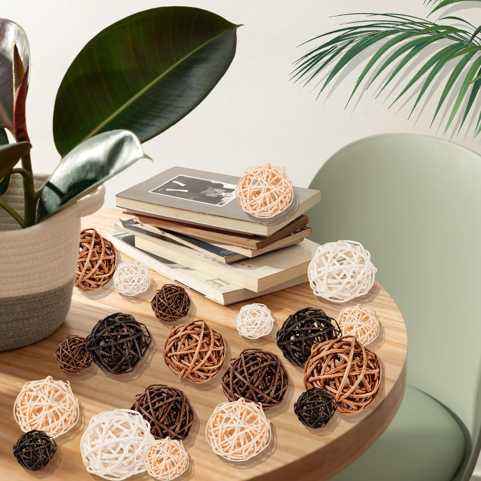 Package includes: This set includes 24pcs beige rattan balls in three distinct sizes: 1.2"/2"/ 2.4". The diverse sizes allow for creative arrangements and add a dynamic visual appeal to any table centerpiece, ensuring your home decor stands out with a charming, textured look.