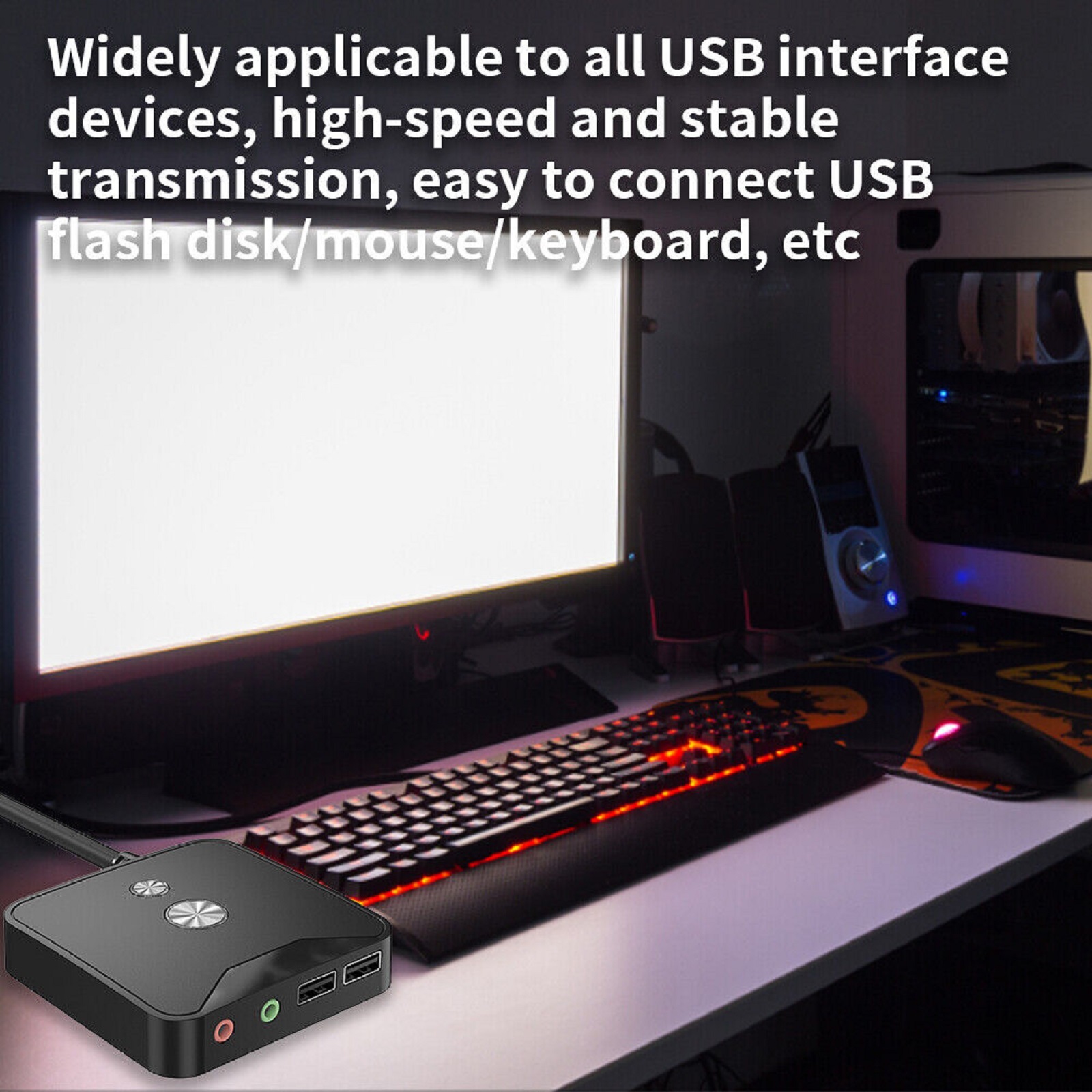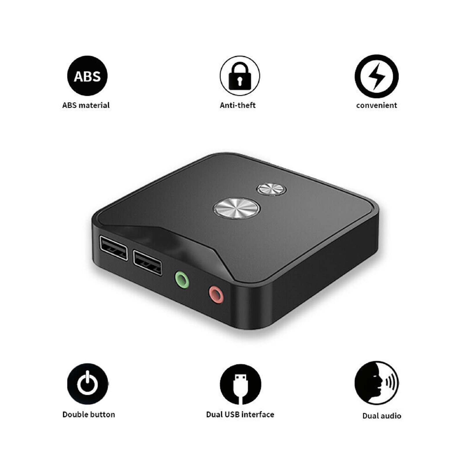 Feature: 1. High Quality Material: ABS plastic, solid and durable, comfortable to handle, anti-fingerprint, anti-scratch. 2. Three Major Functions: Dual USB+dual frequency, providing two USB2.0 interfaces, one start button, restart button, and dual audio interface (input and output), Dual audio interface+dual USB interface. Extend the audio interface to the desktop, which is convenient and fast to use, with pure sound quality and smooth plugging, Dual USB interface, efficient and safe to use, widely applicable to all USB interface devices, high-speed and stable transmission, easy to connect USB flash disk/mouse/keyboard, etc. 3. Internet Bar Anti-theft: With the desktop mobile switch, the computer case can be locked by pressing the power on and restart button on the desktop mobile switch, Let the thieves who steal valuable parts such as CPU/memory/graphics card by disassembling the machine have no way to start. 4. Practical Design: The product can be connected with the corresponding interface on the main board of the computer, and there is a anti-theft block card on the product extension line, which is safer for the owner of the Internet cafe. The total length of product extension cable is 1.6 meters, which is enough to be placed anywhere on your computer desktop 5. Wide Application: Desktop mobile switch is widely used in Internet cafes/home/hotels/KTV/schools/companies/hotels/hotels, etc.