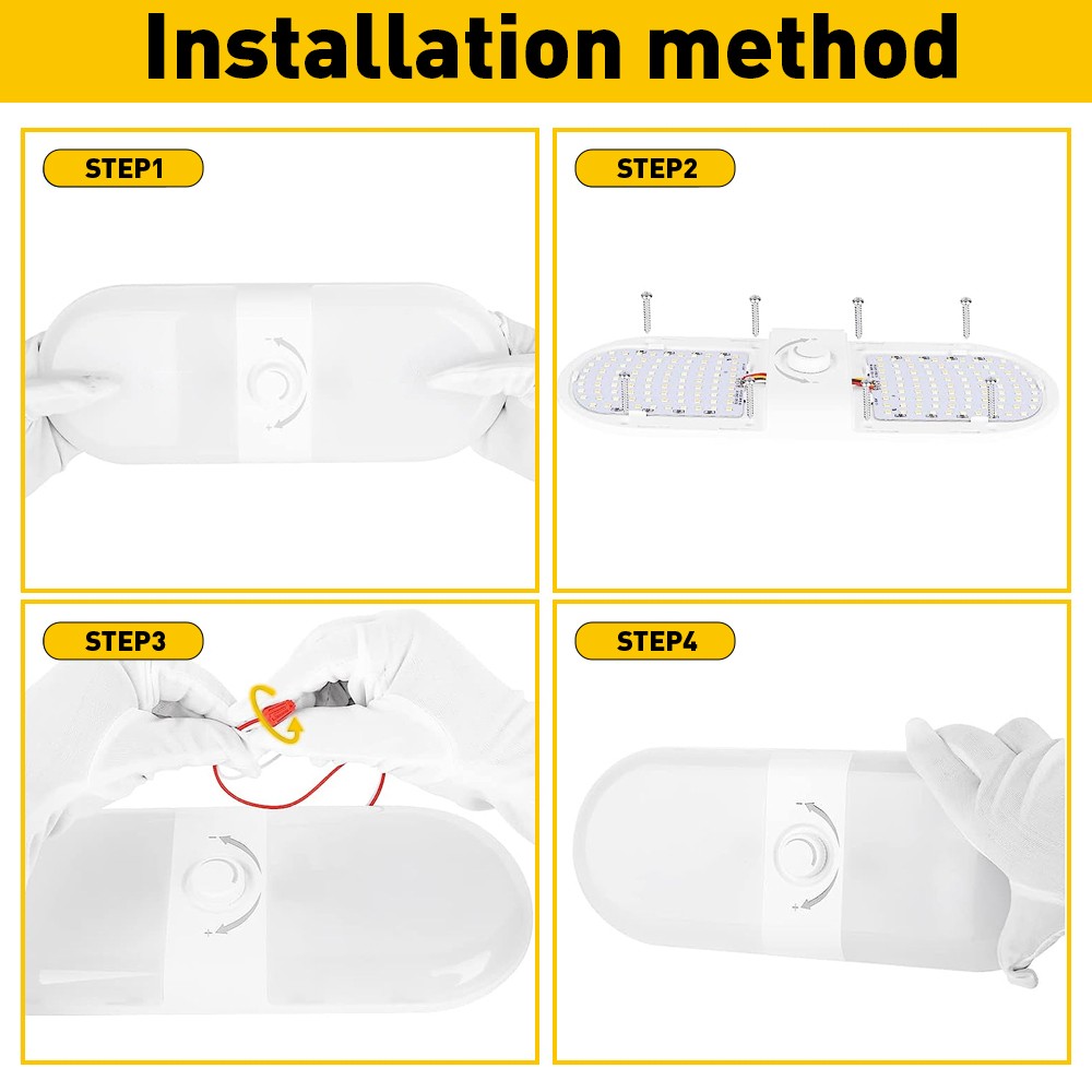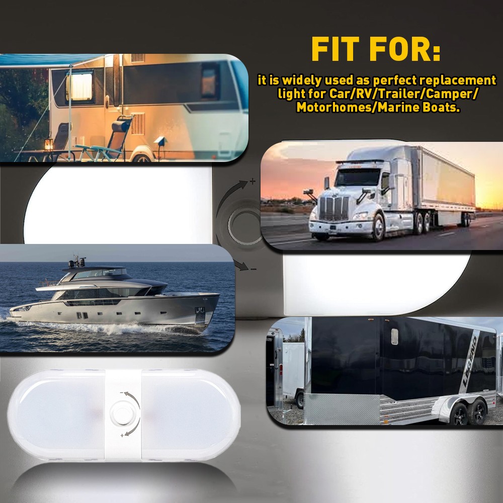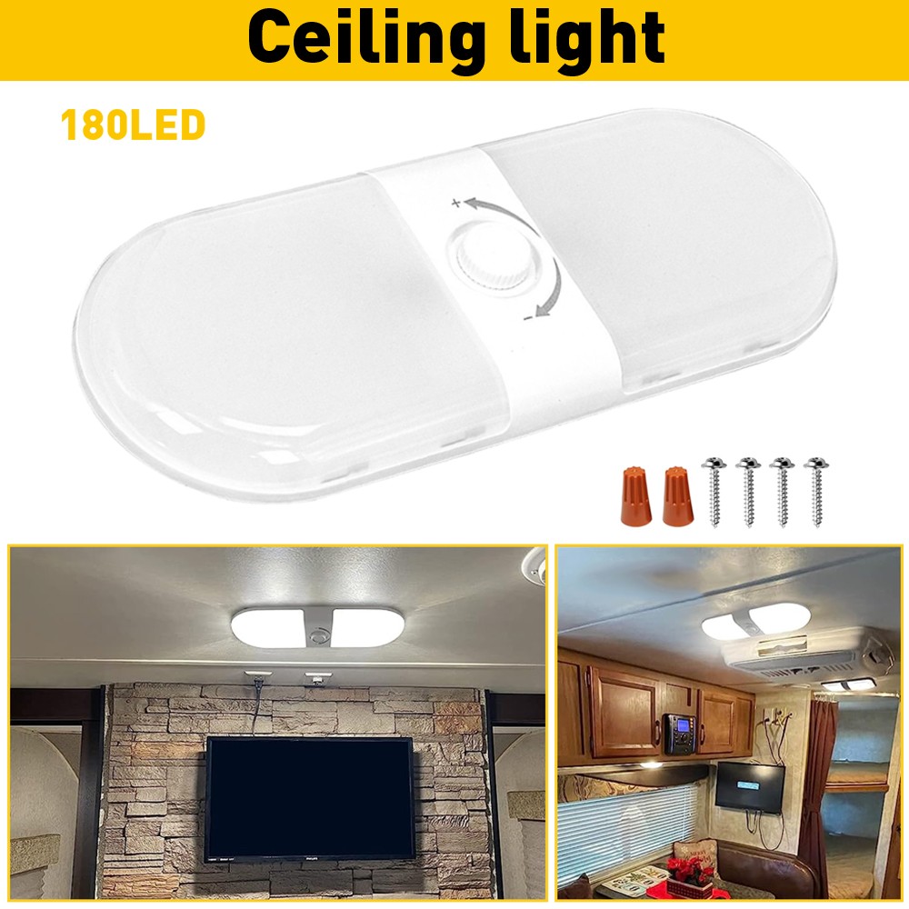 Features: *3 Color RV Interior Light RV interior lights have 180 light beads evenly distributed (90 cool white and 90 warm white), which can achieve 3 color modes (warm white/natural white/cool white). 1.Warm white is suitable for lighting at night before sleep. 2.Natural white is suitable for reading and writing. 3.Cool white is suitable for lighting activities at night. * 3 Color Temperature Switching 1. Short press the switch to change the colors between white(6500K)/warm white(4200K)/warm(2700K); 2. Long press the switch to turn OFF the light; 3. Rotate the switch to adjust the brightness from 10%-100%.(Flexible to compatible with your daily habit and easy to control.) *Memory Function & Night Light Indicator The 12-volt LED lights with a night light indicator(soft green glow) on the switch help you find the light button without opening another night light at midnight. *Easy to Install 1.Open the light cover(press and hold the light cover to remove it to both sides) 2.Fix the screws through the holes on the light board to the place you want to install. 3.Connect the wire and cover the wire crimping cap. *Eye Protection Design Adopts uniform distribution of light beads and thickened PVC lampshade design to make the light scatter evenly without dazzling and spots, which is suitable for small space lighting.