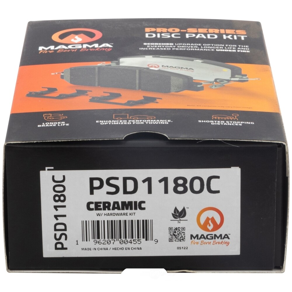 WHY MAGMA? - Today's harsh stop and go environment can create very high heat levels in your braking system which can reduce the vehicle's ability to stop. Extreme high temperatures can be reached in many braking situations such as - Stop and Go Traffic, Mountain Driving, Hauling or Towing, Emergency Stops, Spirited Driving and Long, Sustained Braking. At MAGMA Brakes, we use FIRE to fight FIRE. Our brake system components are made using advanced, state of the art techniques and treatments that ensure our brakes will stand up to the heat.MAGMA Pro-Series brake pads feature...1. Scorched, copper free friction formulations for overall ltimate braking performance2. Vulcanized OE style rubber core shims for unsurpassed noise suppression3. Heat-tempered upgraded dual-coated stainless steel hardware kits to restore the brake pad to caliper interface to "like new" condition (where applicable)4. Heat expansion OE style slots and chamfers to dissipate noise and stand up to the heat5. High-heat resistant brake lubricant included for lubricating critical points during pad installation