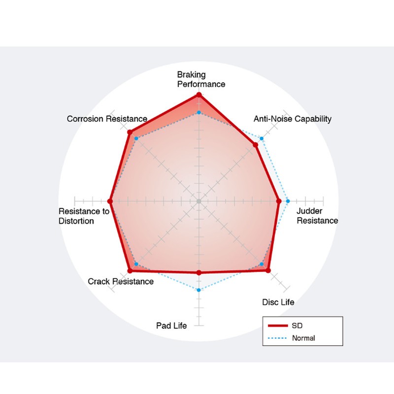 SD Type Front Disc Rotor: Our 6-slot SD brake discs boost braking efficiency by up to 20%. Designed for sports cars and high-load vehicles, the high-carbon material improves durability. The reverse slot pattern enhances pad contact and gas ventilation, while the offset design minimizes judder and noise. Optimized for longer pad life and smoother braking.