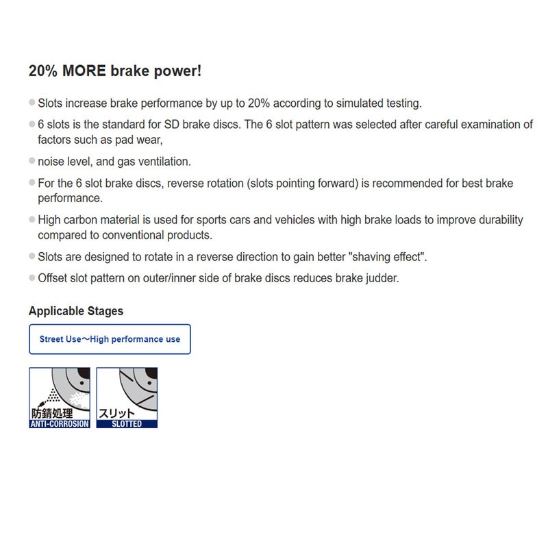 SD Type Rear Disc Rotor: Our 6-slot SD brake discs boost braking efficiency by up to 20%. Designed for sports cars and high-load vehicles, the high-carbon material improves durability. The reverse slot pattern enhances pad contact and gas ventilation, while the offset design minimizes judder and noise. Optimized for longer pad life and smoother braking.