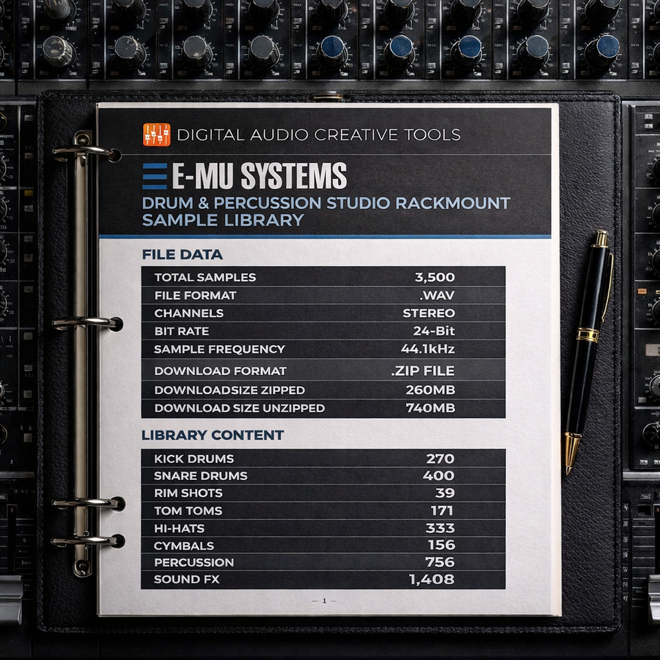This collection delivers hard-hitting drums and tight percussion with a polished yet gritty character. Expect thick low end, snappy transients, and bright, cutting highs that defined countless records across hip-hop, electronic, pop, and film scoring. Every sound reflects the unmistakable E-MU tone: clean, powerful, and full of attitude.