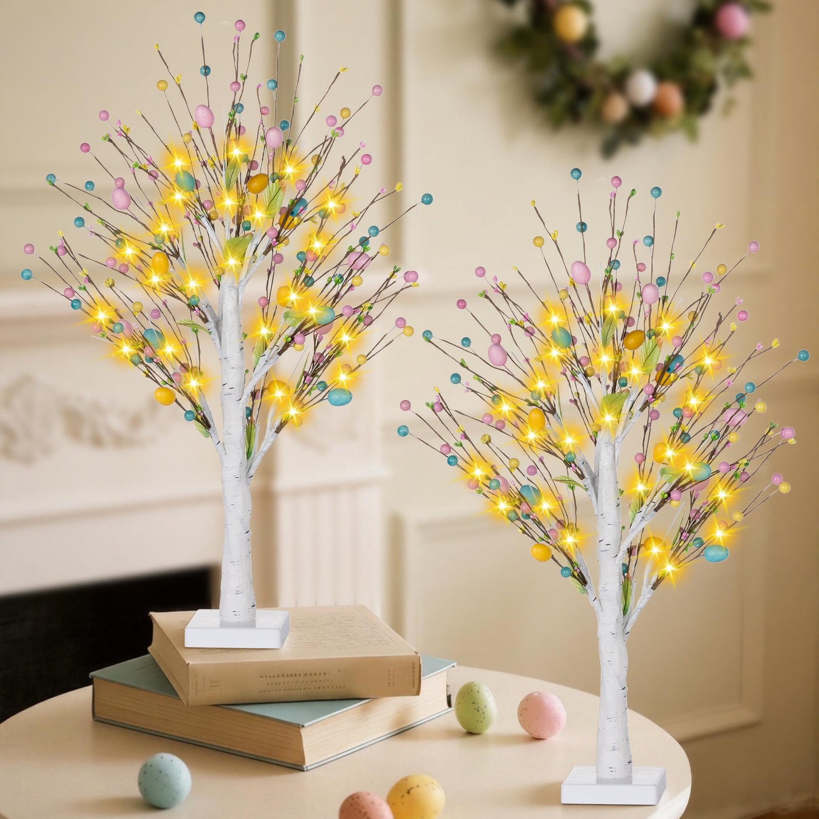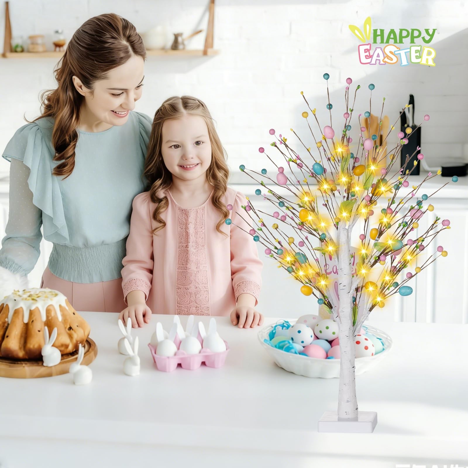 【Pre-lit Easter Egg Tree,Perfect Tabletop Decor】This 2FT Pre-lit Easter Tree is an exquisite spring Easter tabletop centerpiece.This pre-lit Easter egg tree features 24 warm white LED lights,it emits a soft and comforting glow,instantly creating a festive Easter atmosphere. Whether you choose it as a centrepiece for your table or as a mantelpiece decoration, this lighted Easter egg tree will seamlessly integrate into your Easter décor.