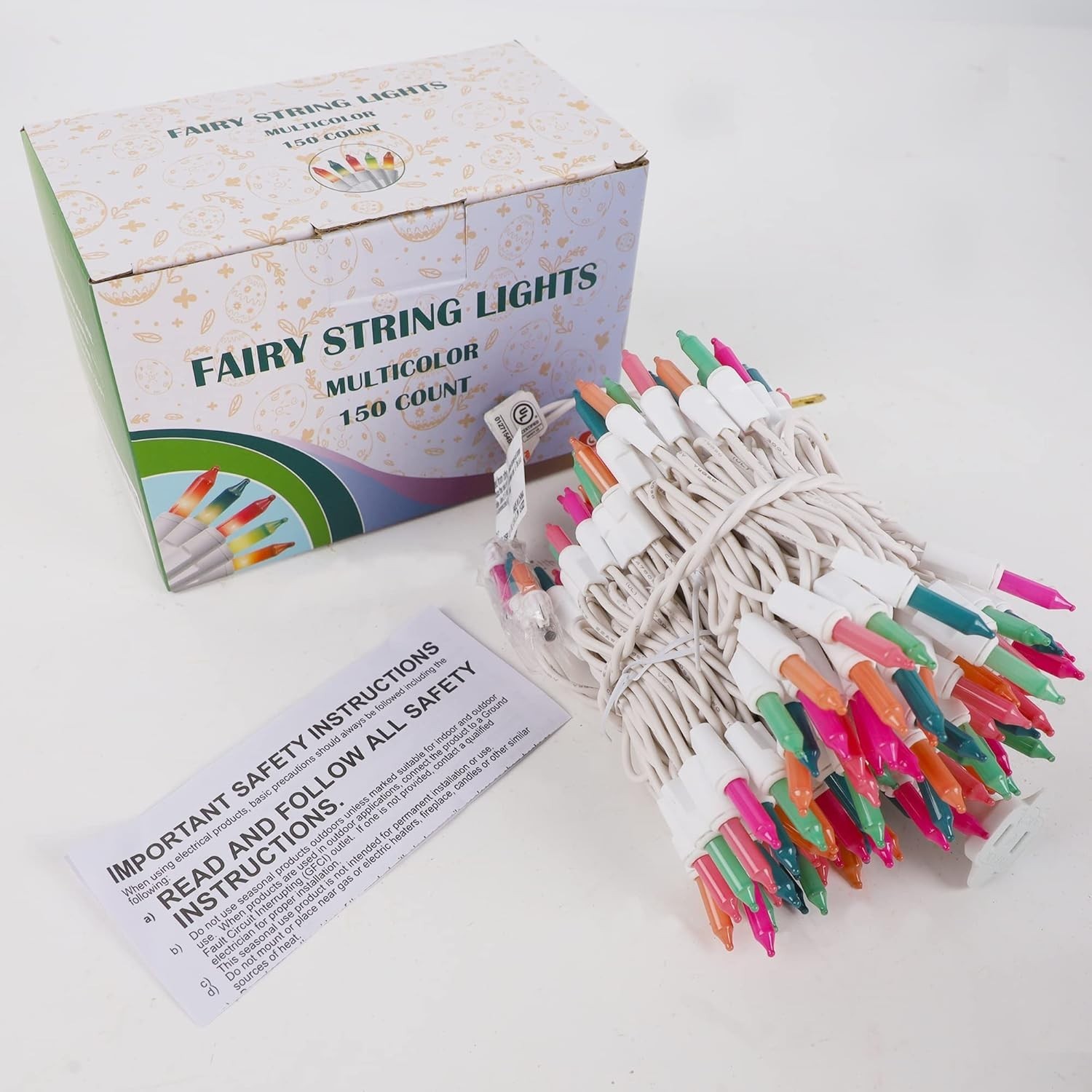 This set includes 150 mini bulbs in 5 vibrant spring colors. Each bulb is spaced 2.5 inches apart, rated at 2.5V and 0.42W, and comes with a built-in 3A fuse for safe operation. Extra bulbs and fuses are included for convenience. UL-certified quality ensures safety for you and your family.