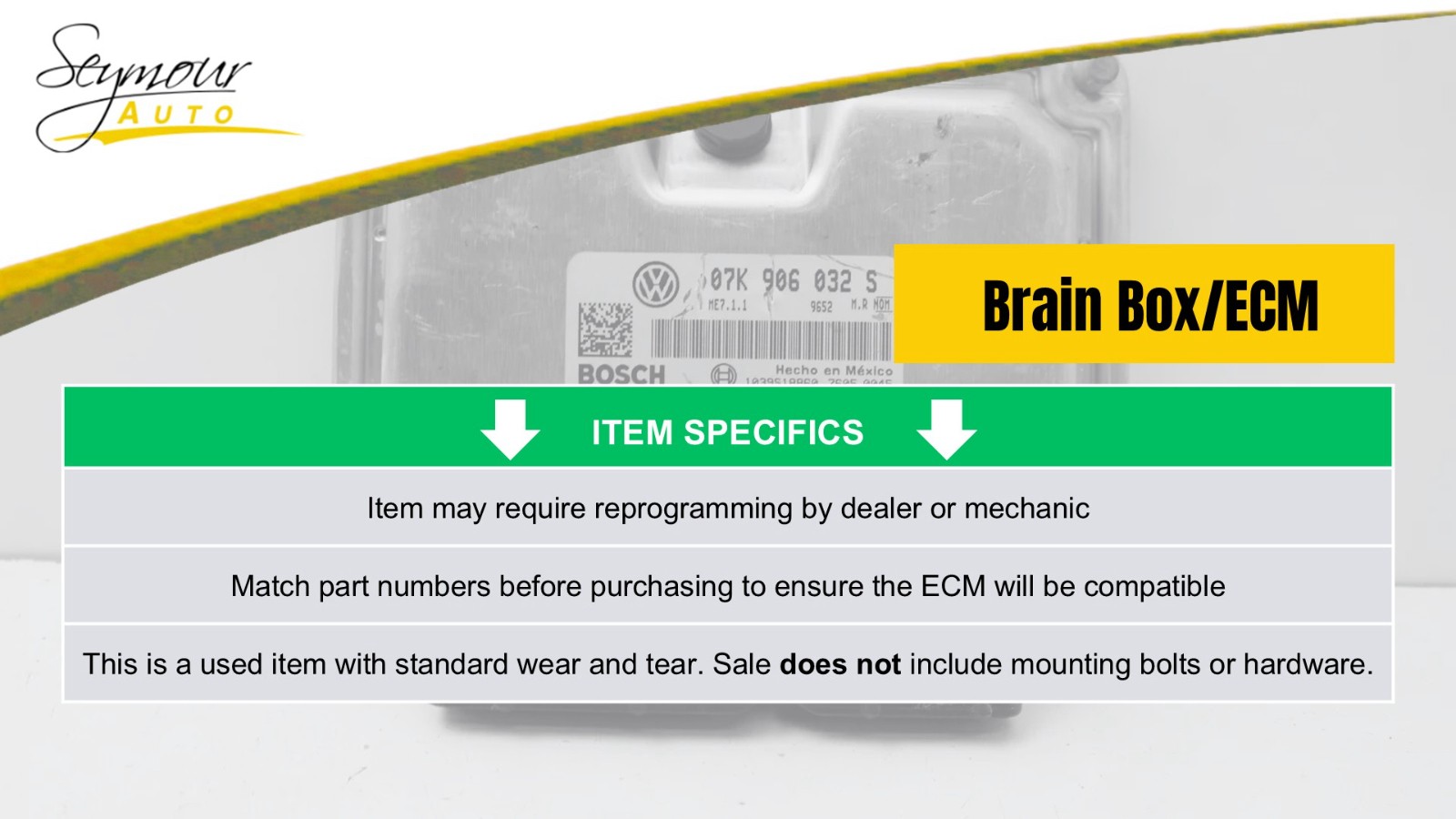 All parts listed as, Pick Up Only, will be held at Seymour Auto Wrecking (107 New Haven Rd, Seymour CT 06483) for the buyer.