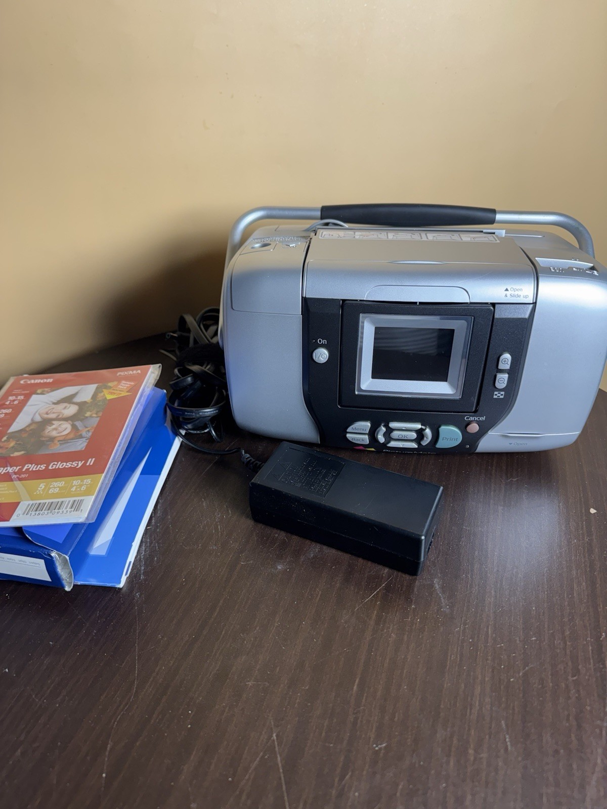 Condition: Pre-owned, tested and working. Printer powers on, screen functions properly. Comes with original box (wear from storage), power cable, setup software CD, instruction manual, and unopened Epson photo paper pack.