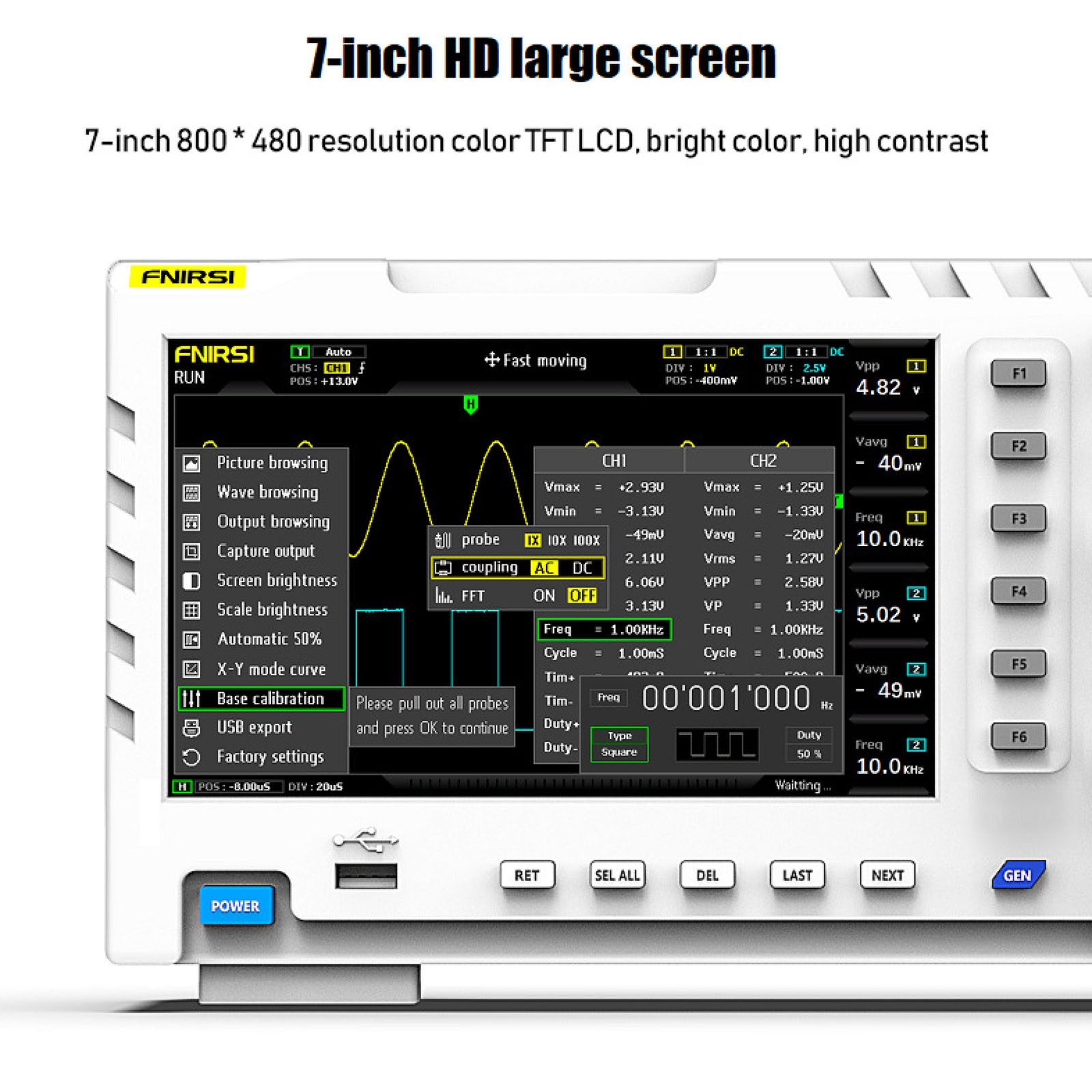 8:Up to 12 parameters measurement:VPP,VP,Vmax,Vmin,Vavg,Vrms,Frequent,Duty+,Duty-,Time+,Time-,Period