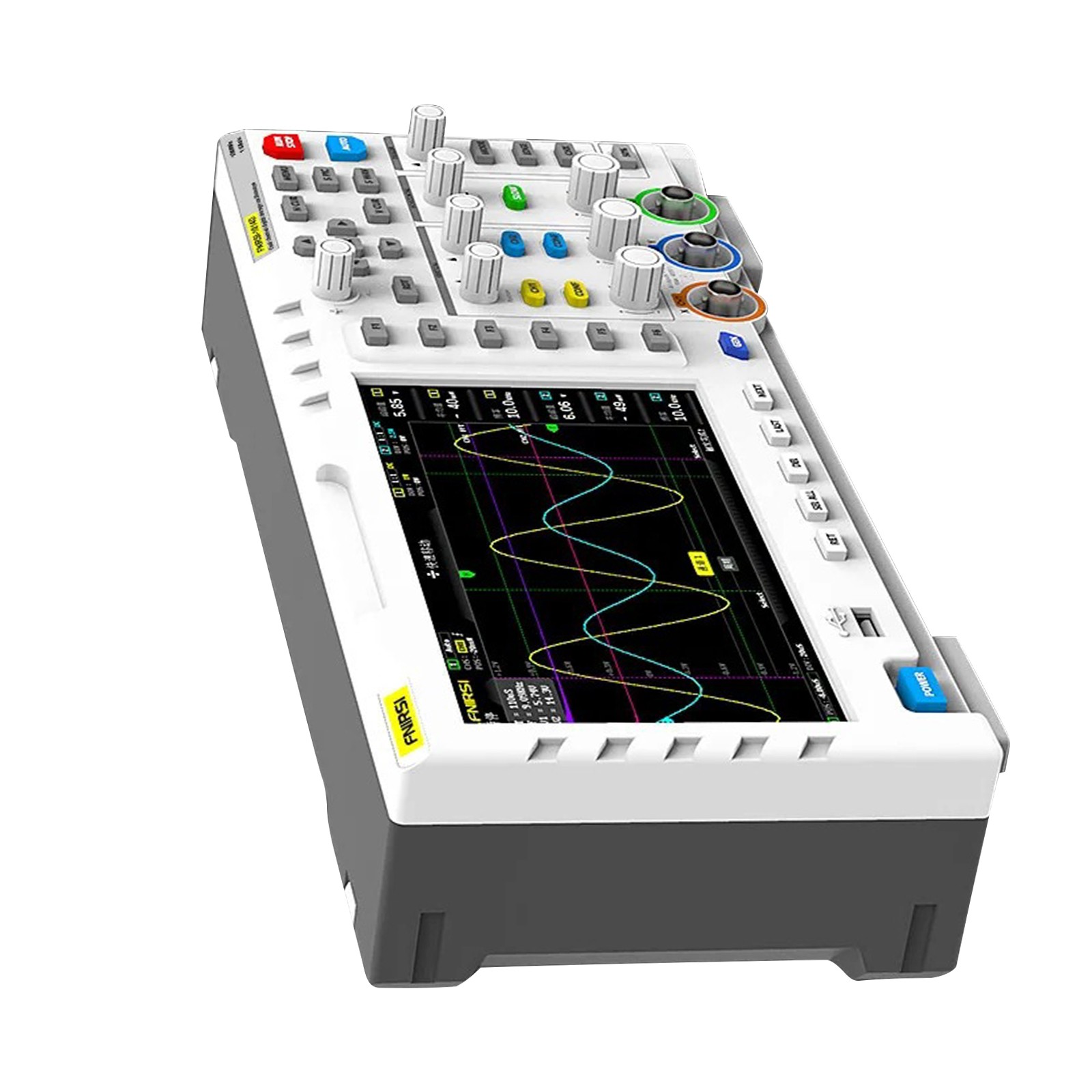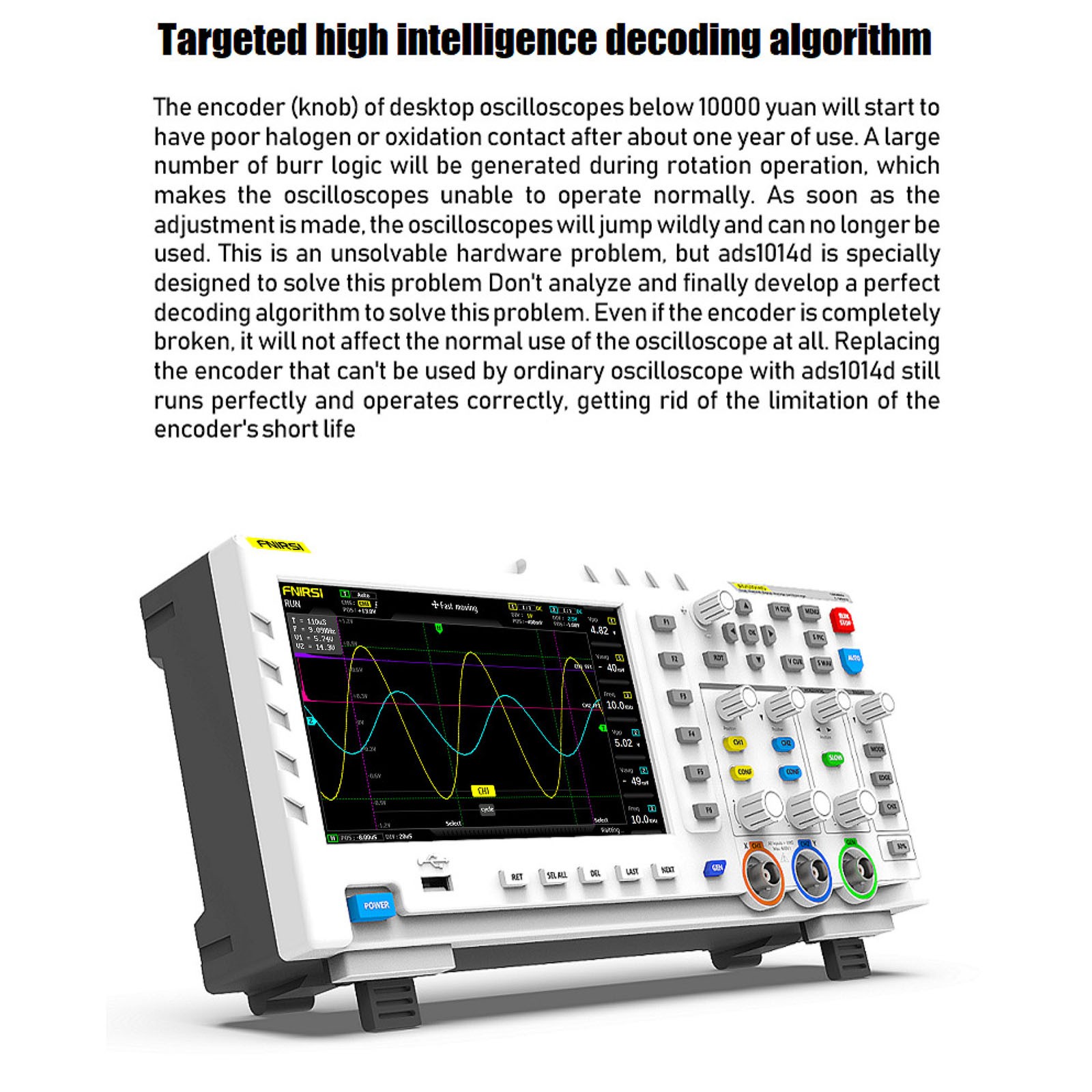 FNIRSI-1014D is a two in one oscilloscope and signal generator launched by FNIRSI. It has comprehensive functions and high practicability. It is a cost-effective dual channel desktop oscilloscope for the maintenance industry and R & D industry. The oscilloscope has a real-time sampling rate of 1GSa / s and 100MHz* 2 analog bandwidth; complete trigger function (single time / normal / automatic), both for periodic analog signal and aperiodic digital signal can be used freely; built in DDS function signal generator and the industry's original chopping output (@ 2.5vpp), all signal frequency step is 1Hz, support 14 kinds of standard function signal and a customizable chopping signal, chopping The output device intercepts part or the whole part of the complex signals measured by the oscilloscope as the output signal of the signal generator, which can store up to 1000 customized cut-off signals; the built-in high-voltage protection module can tolerate up to 400V continuous voltage, without worrying about the oscilloscope burning accident caused by the probe not moving to 10x gear. Large time base scrolling mode, which can monitor slow level changes; equipped with efficient one button auto, which can display the measured waveform without tedious adjustment; display high-definition LCD with 7-inch 800 * 480 resolution; cursor measurement function, when manually reading amplitude and frequency parameters, it does not need to read the background scale unit and quantity, and it does not need to convert to directly get peak to peak and frequency Extremely convenient screen capture and waveform storage function, built-in 1GB storage space, can store up to 1000 screen capture pictures + 1000 groups of waveform data, the storage process is simple and fast, save the current waveform with only one click, no cumbersome prompts and choices to save the current data, very convenient; powerful waveform image manager, support thumbnail browsing, view, view details The functions of page turning, deleting and waveform enlarging, reducing and moving are convenient for secondary analysis. The fuselage is equipped with USB interface, which can be connected with the computer to realize the sharing of its own screen capture pictures and the computer, which is convenient for secondary analysis; Li Shayu's graphic display function can be used to compare and judge the amplitude, frequency and phase of two groups of signals; FFT viewing function can estimate the harmonic component of signals; Li Shayu's graphic display function can be used to compare and judge the amplitude, frequency and phase of two groups of signals;
