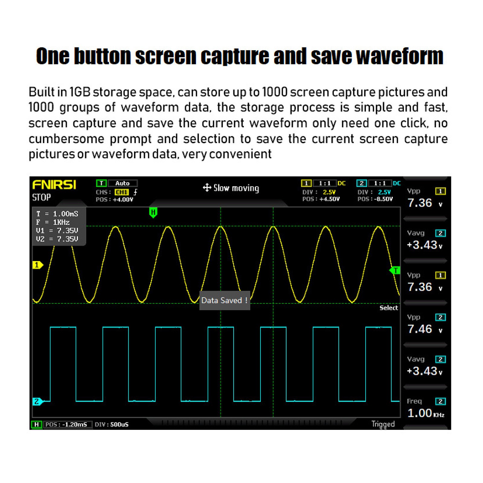 14:Built-in 1GB storage space, can store up to 1000 screenshots + 1000 sets of waveform data