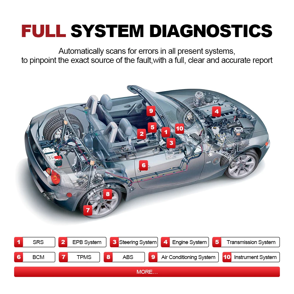 1. ALL systems diagnostics , Android based 9.0 operate system touchscreen tablet . A full detection for ALL systems read codes ,erase codes ,live data and read ecu information etc (ABS, SRS, Engine, Transmission, Brake System, Emission System, Fuel system, Light system, Wiper System etc.).