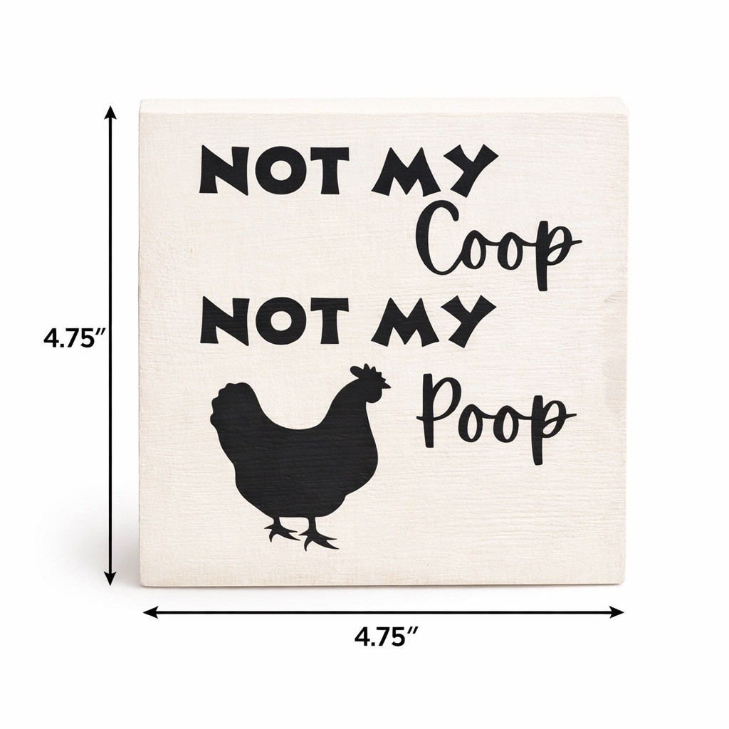 Farmhouse wood block sign with a humorous chicken-themed message. This charming sign displays the phrase 'NOT MY COOP NOT MY POOP' in bold black lettering alongside a silhouette of a chicken. Its distressed cream finish and simple design evoke a rustic, country aesthetic. Perfect for adding a touch of farmhouse whimsy to your kitchen counter, shelf, or mantelpiece. Ideal for country-themed kitchens or as a lighthearted gift for chicken enthusiasts.