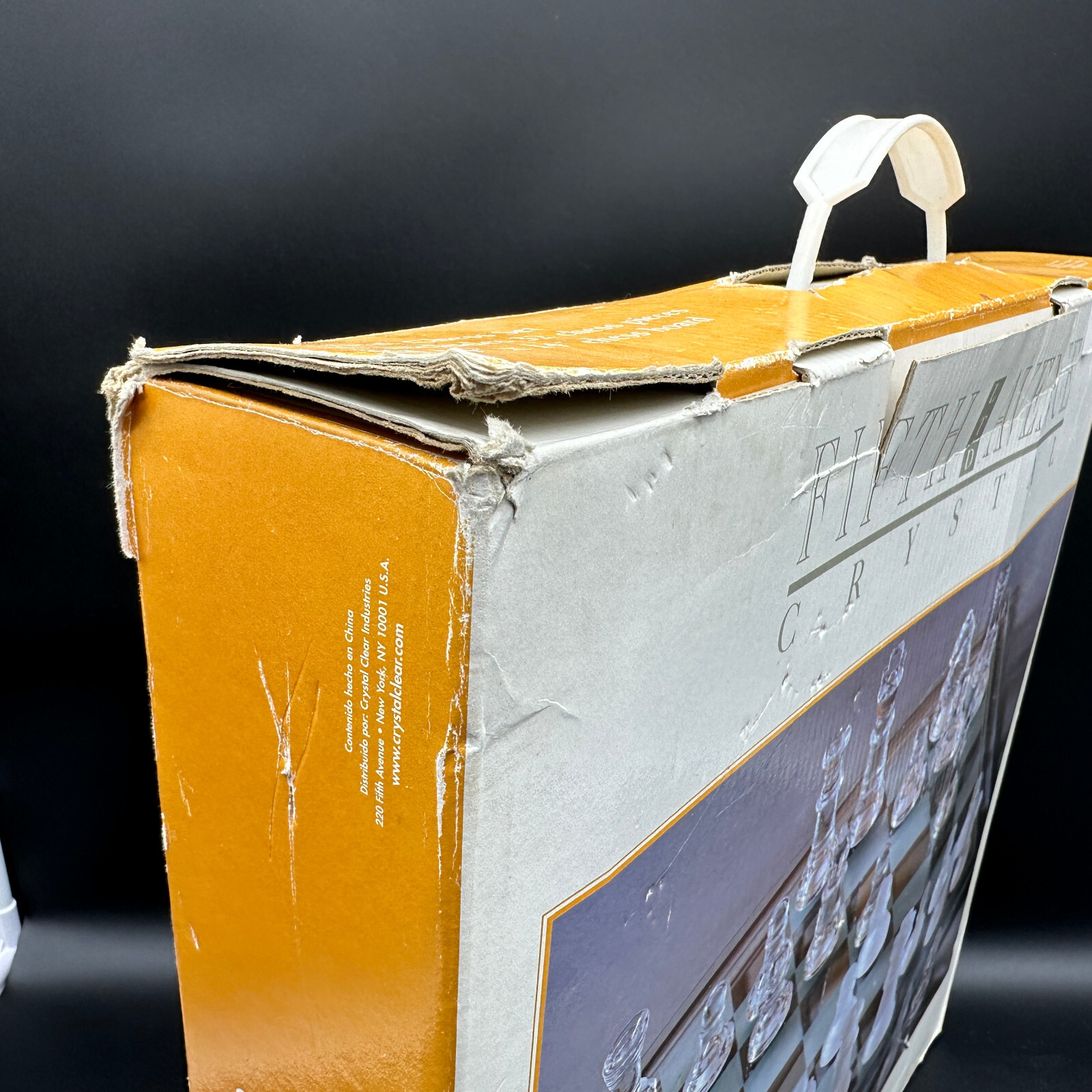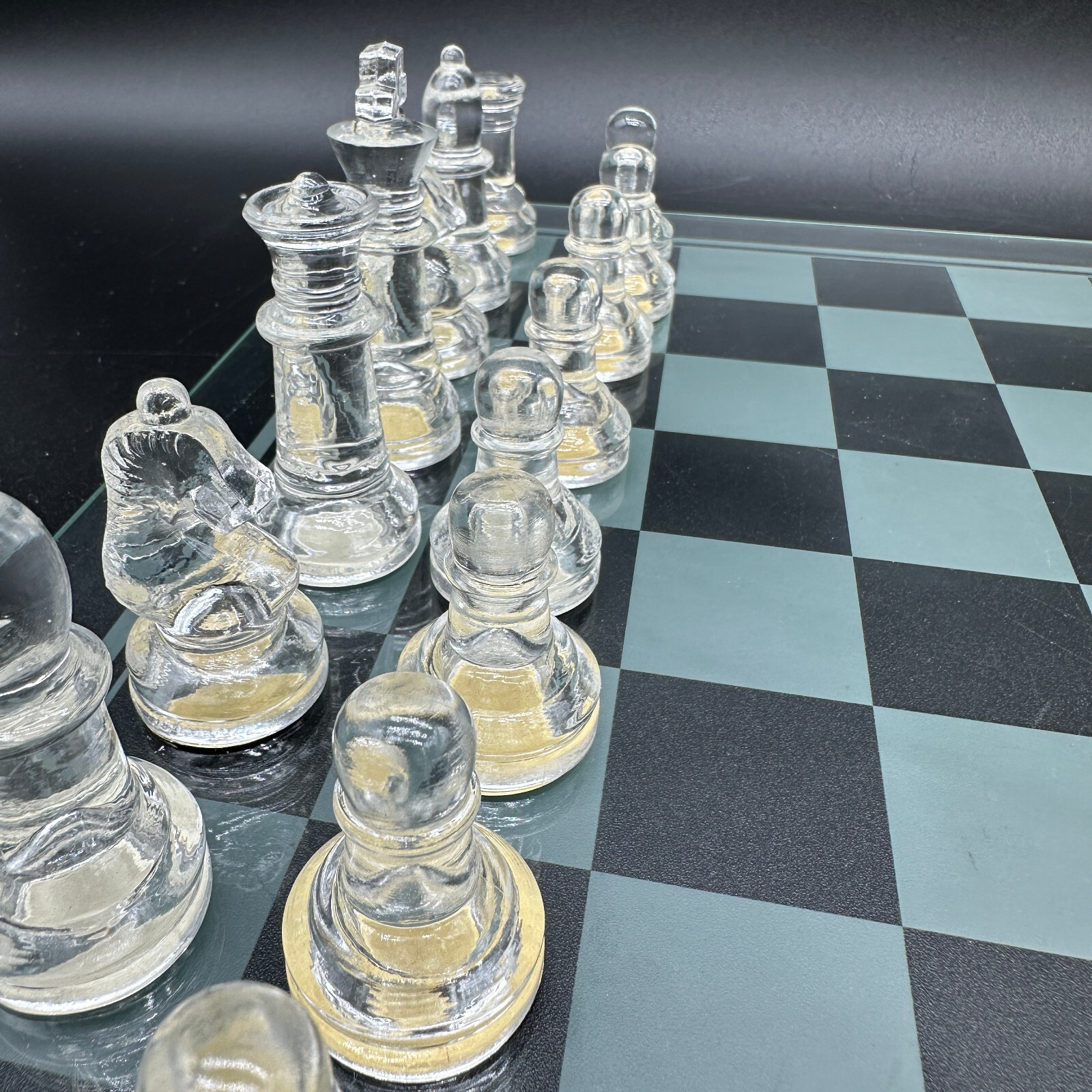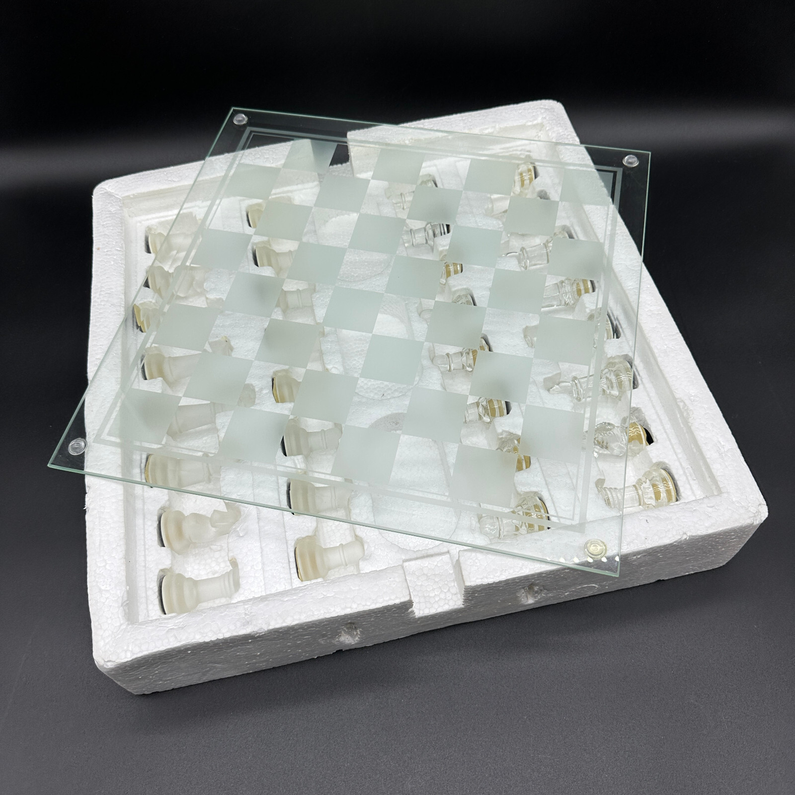This crystal chess set is in great condition with no defects found. All pieces are complete and ready for play. The original box shows some wear but remains functional for storage and transportation.