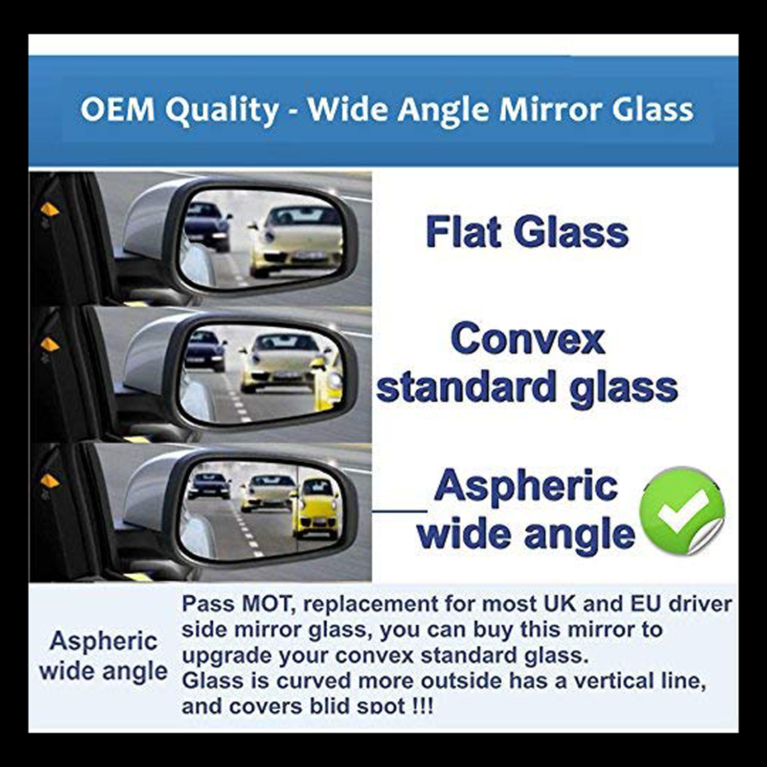 Note : This is a Direct OEM Replacement Part ( Push to Fit on Mirror Housing ) Glass is Aspherical, Wide-angle mirror to see blind spot area and helps in approching juctions and over taking.