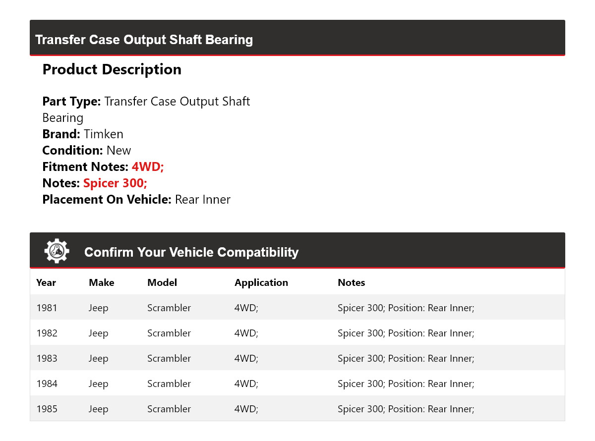 Transfer Case Output Shaft Race Rear Inner Timken For 1981-1985 Jeep Scrambler