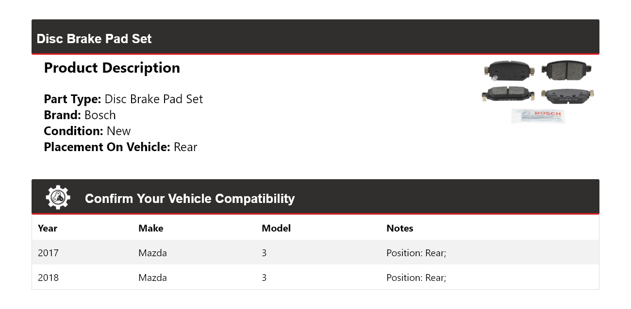| 2018 | Mazda | 3 | Position: Rear; |