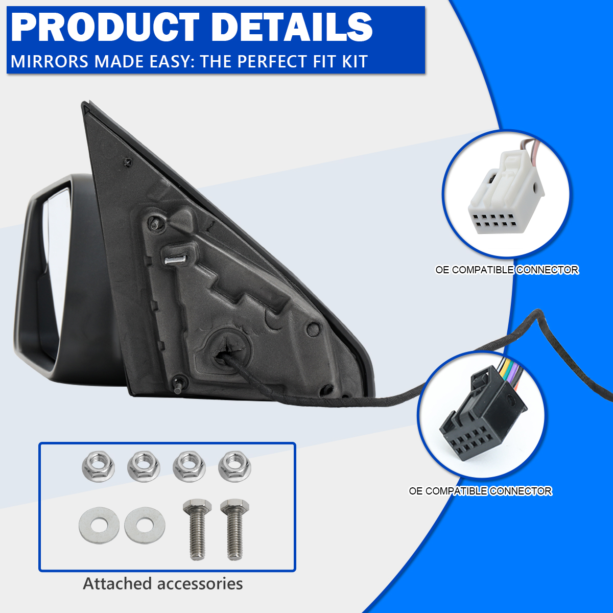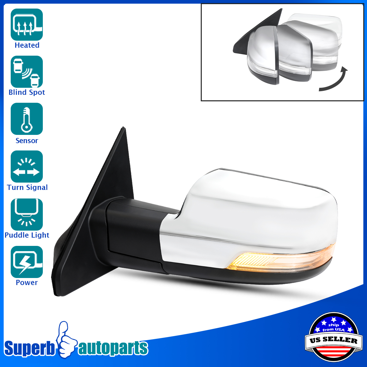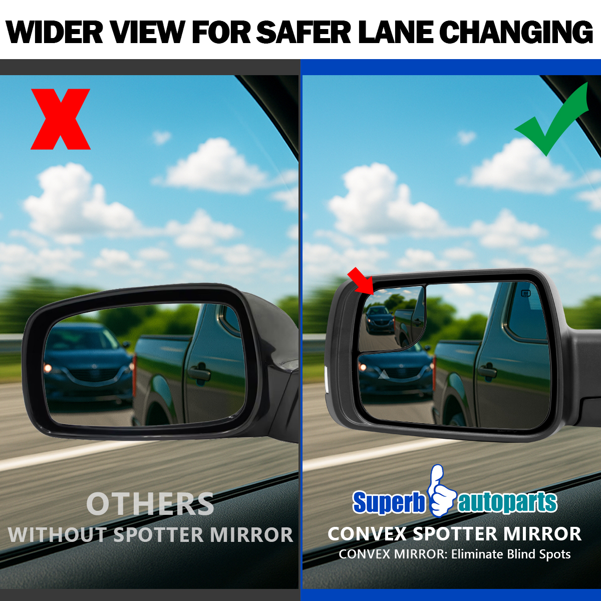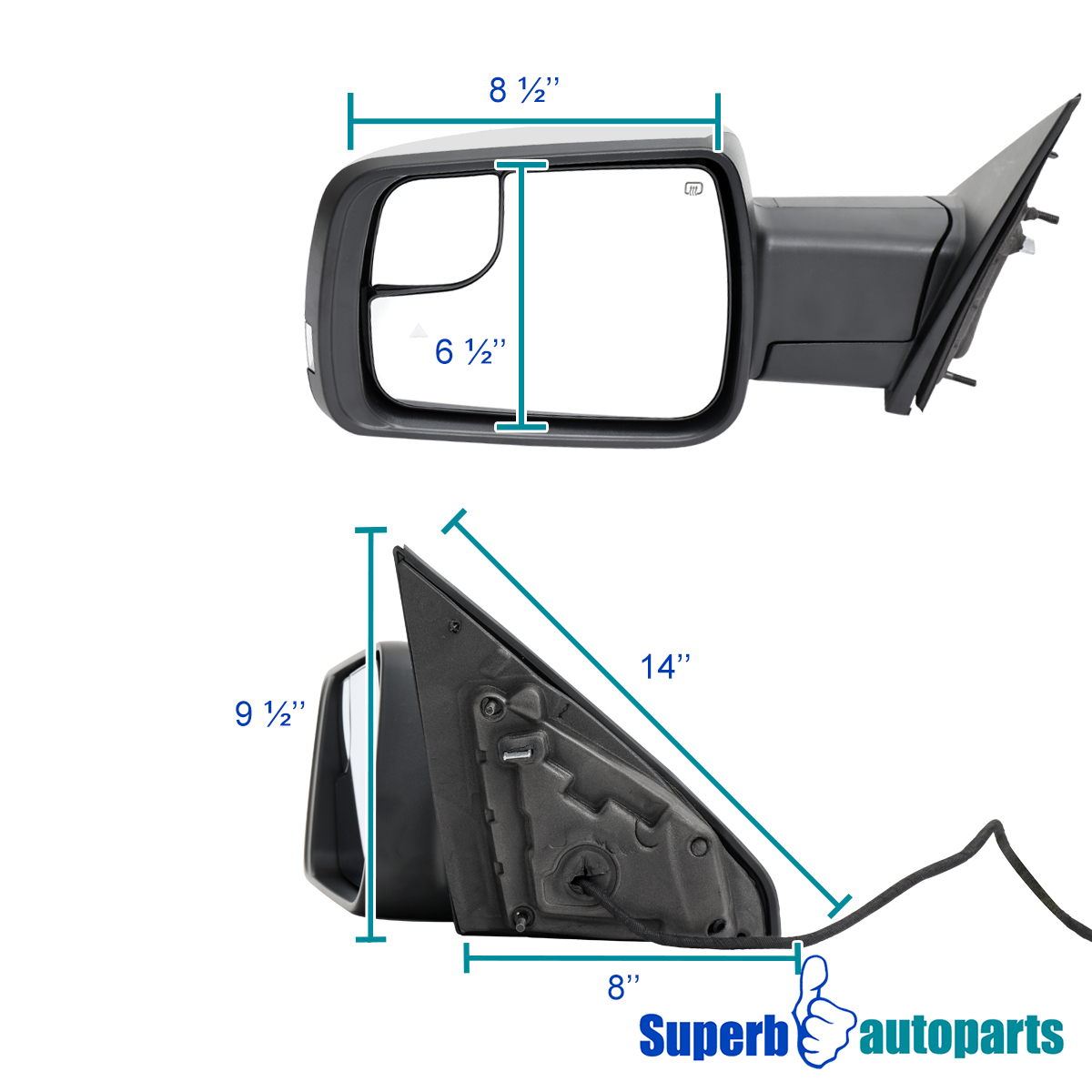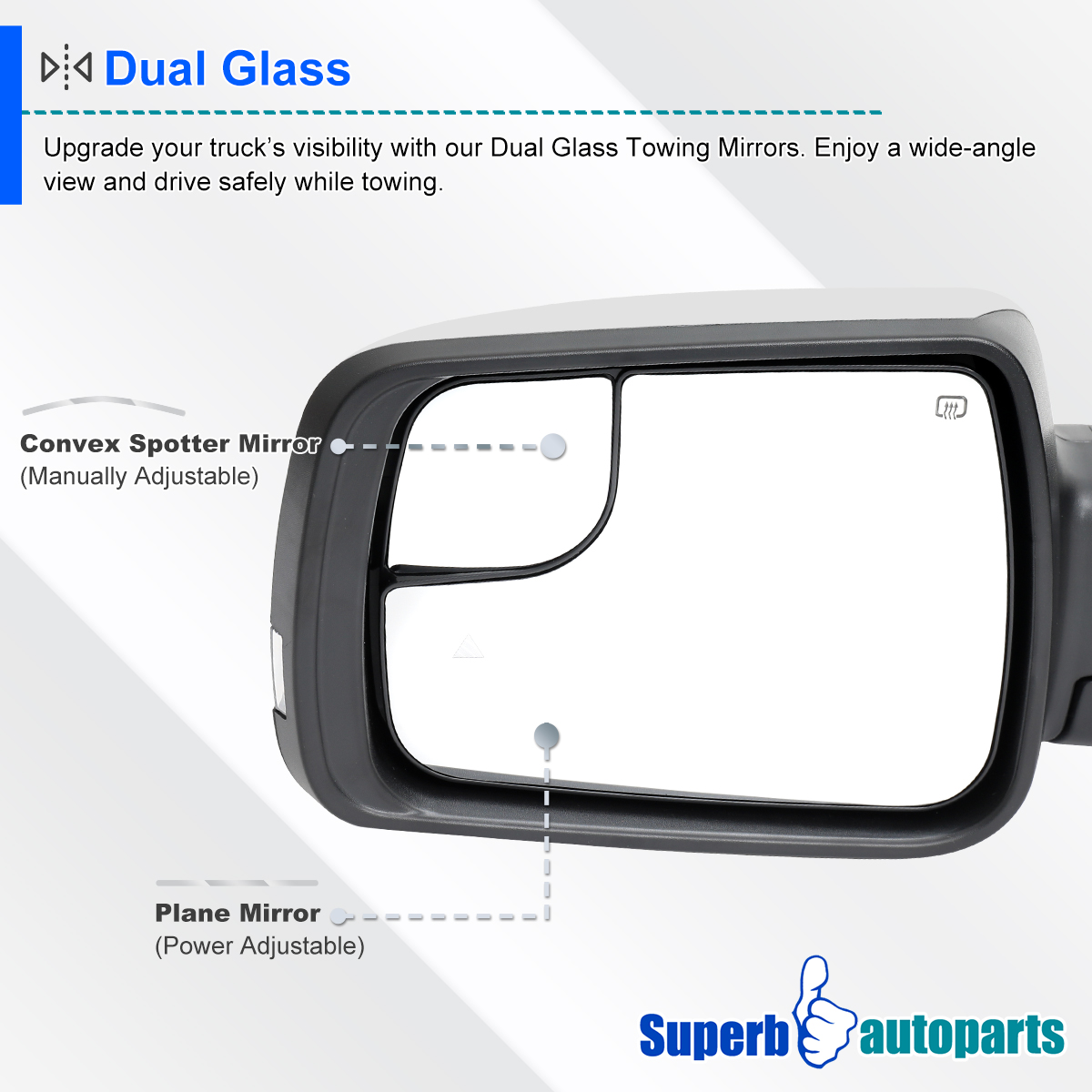 Comes with a piece of power adjustable side mirror with convex spotter mirror.