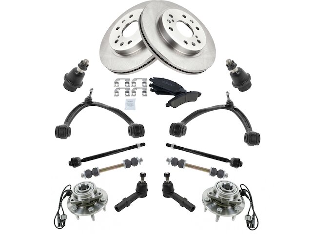 Package Contents: (2) Front Sway Bar Links; (2) Front Outer Tie Rods; (2) Front Inner Tie Rods; (2) Front Lower Ball Joints; (2) Front Wheel Bearing & Hub Assemblies; (2) Front Upper Control Arms with Ball Joints; (2) Front Brake Rotors; (1) Front Semi-Metallic Brake Pad Set with Contact Point Grease & Hardware