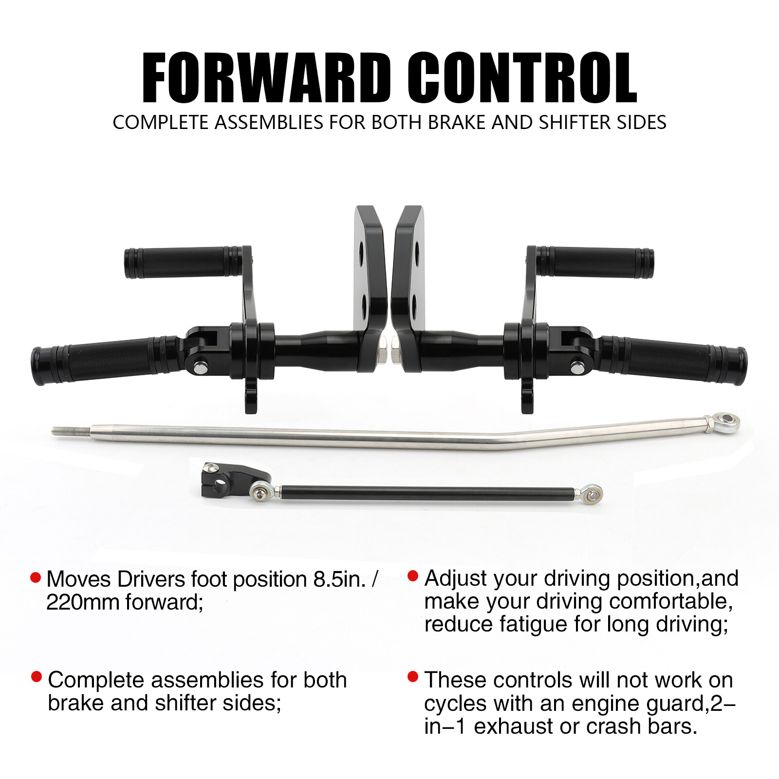 - Moves Drivers foot position 8.7" (220mm) forward