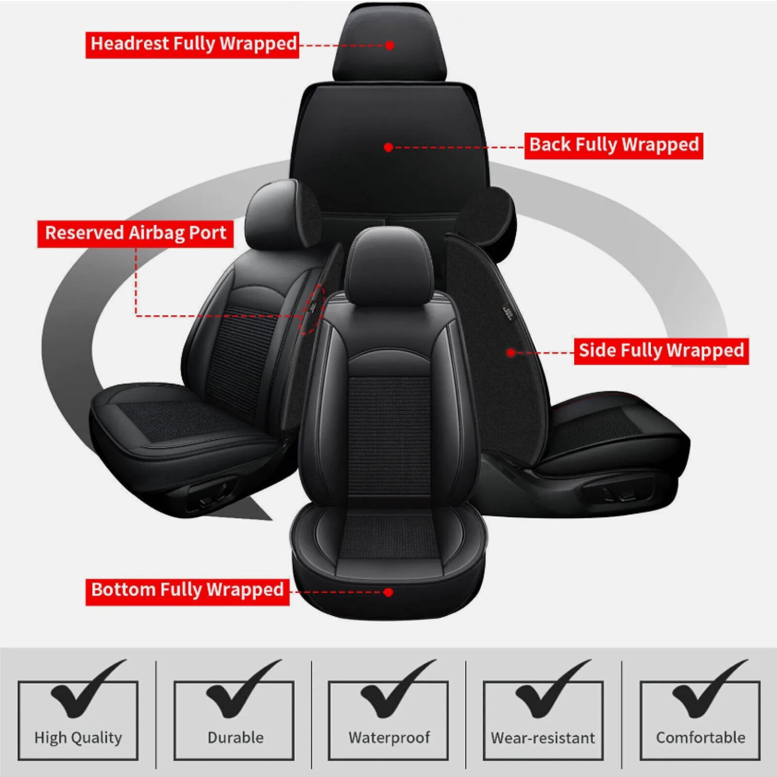 The side and head caps of the front seats are fully surrounded by elastic cloth, providing comprehensive protection, better fit and not easy to shift. It is not only more beautiful and practical, but also suitable for more models, with stronger versatility.