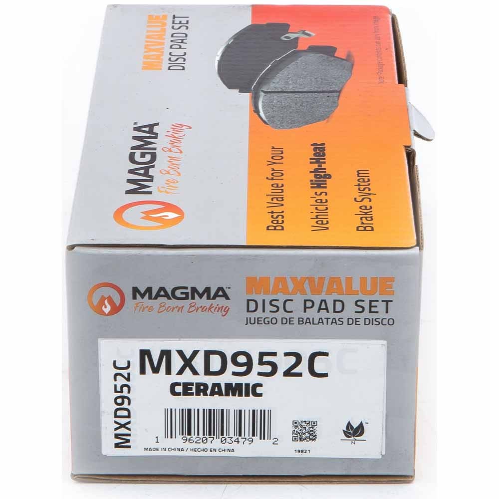 WHY MAGMA? - Today's harsh braking environments can create very high heat levels in your braking system which can reduce the vehicle's ability to stop. Extreme high temperatures can be reached in many braking situations such as - Stop and Go Traffic, Mountain Driving, Hauling or Towing, Emergency Stops, Spirited Driving and Long, Sustained Braking. At MAGMA Brakes, we use FIRE to fight FIRE. Our brake system components are made using advanced, state of the art techniques and treatments that ensure our brakes will stand up to the heat.MAGMA MaxValue brake pads feature...1. Premium friction materials for superior braking performance2. Fully post-cured friction for right out of the box performance3. Noise suppressing woven shims attached for quiet stopping4. Anti-corrosion paint coating for longer service life
