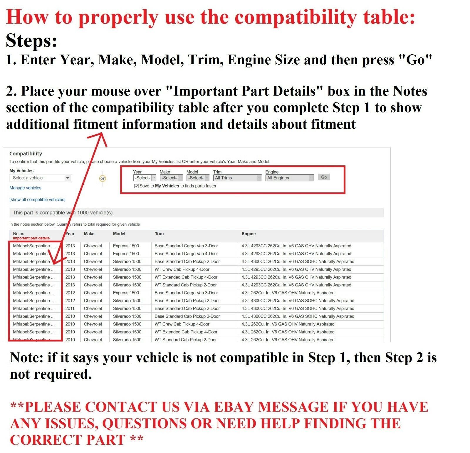 Be sure to hover your mouse over the 'Important Part Details' column in the list of matching vehicles for a FULL VIEW of any notes that may affect the fitment on your vehicle. If you have any questions, or have any trouble viewing the 'Important Part Details' information, feel free to contact us.