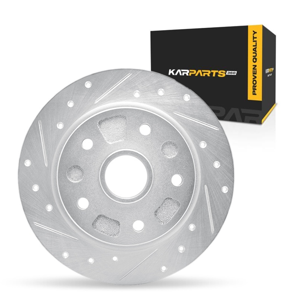 | | Detail Product Information | Product Info: Part: Brake Rotor Color: Silver Drilled and Slotted Center Hole Diameter: 59.5 millimeters / 2.34 inches Discard Thickness: 8 millimeters / 0.31 inches Nominal Thickness: 10.1 millimeters / 0.40 inches Outside Diameter: 259 millimeters / 10.20 inches Stud/Lug Hole Quantity: 5