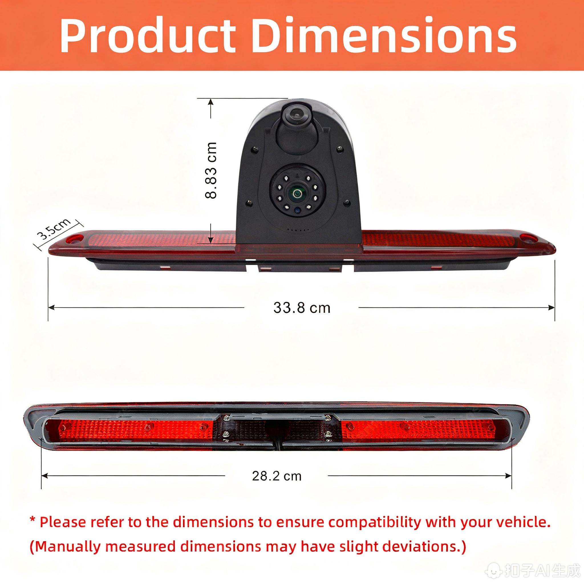 PLEASE NOTE: Please check that the image and dimensions of the camera matches the existing dimensions of the brake light housing on the vehicle.
