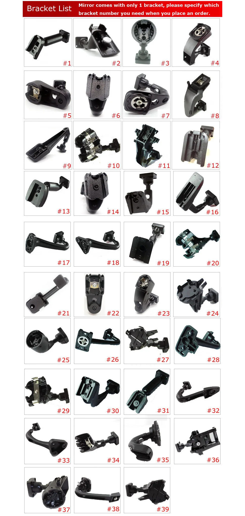 This kit includes the #1 bracket by default. If unsure about compatibility, please send a clear photo of your windshield button or original mirror bracket when ordering. We have other bracket styles that may fit your vehicle.