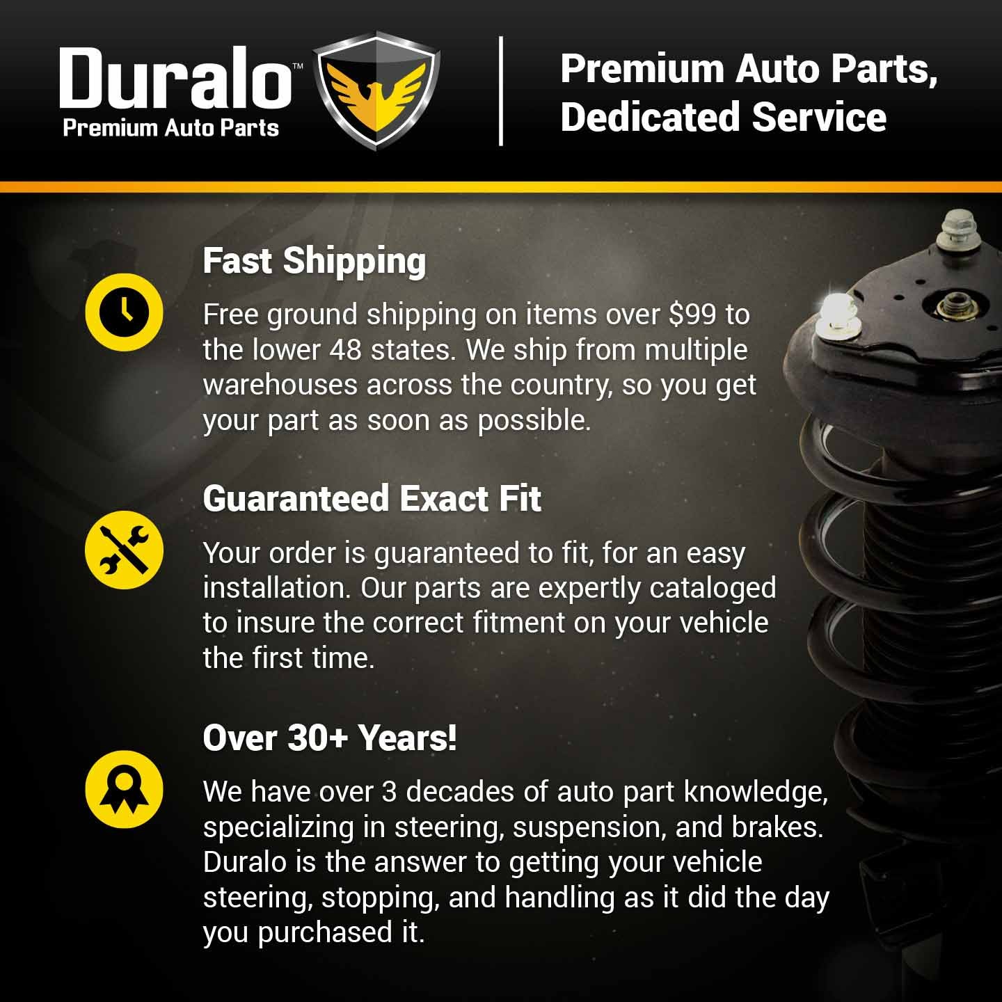 Duralo Complete Strut and Spring Assemblies are manufactured in state of the art factories and are designed to be exact replacements for the original parts. We're so confident in the quality that we back them with a limited lifetime warranty.