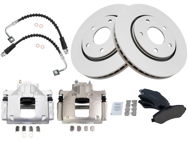 Package Contents: (1) Front Ceramic Brake Pad Set; (2) Front Brake Calipers; (2) Front Premium G-Coated Brake Rotors; (2) Front Replacement Brake Hoses