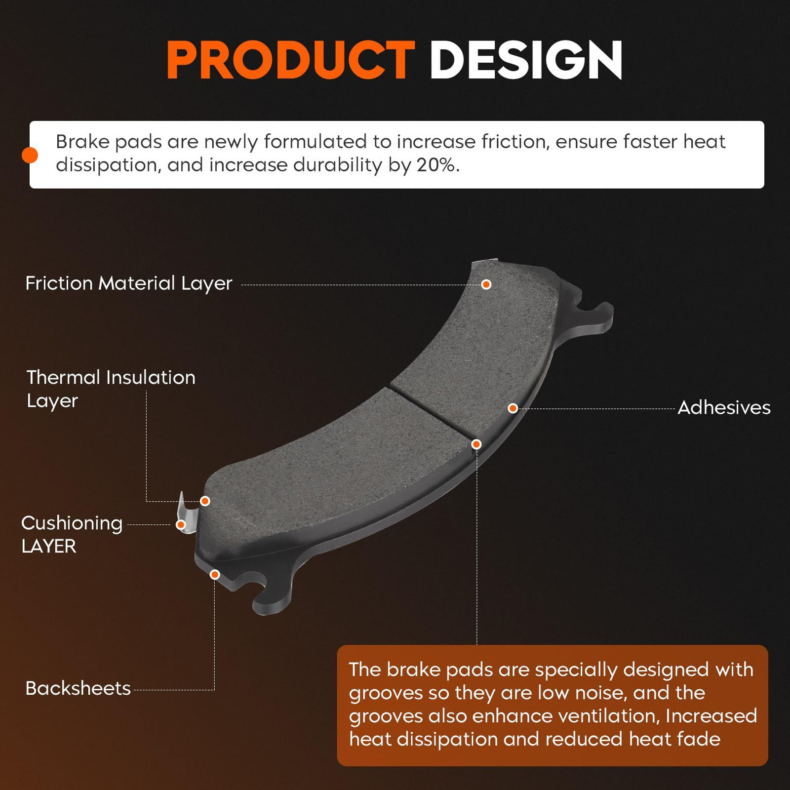 Product Design: The brake pads are specially designed with grooves, so that there is almost no noise, especially squealing, when braking, the braking effect is excellent, and the grooves can also enhance the ventilation ability.