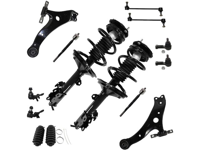Features:- Kit Includes: (2) Front Strut w/Coil Spring + (2) Front Lower Control Arm + (4) Front Inner Outer Tie Rod + (2) Front Sway Bar Link + (2) Front Lower Ball Joint + (2) Rack Boot